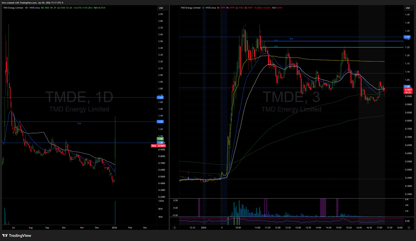 TMDE was an intraday runner on no news but never really went parabolic. I avoided the 1-minute signals because there was psychological resistance just below $1 and the price action wasn’t that clean. That avoidance likely saved me a loss. Later, the 3-minute started triggering and had a nice pullback to $1, but this falls into the “IR setups” category for me, which historically aren’t big money makers. I stayed hands-off here.
