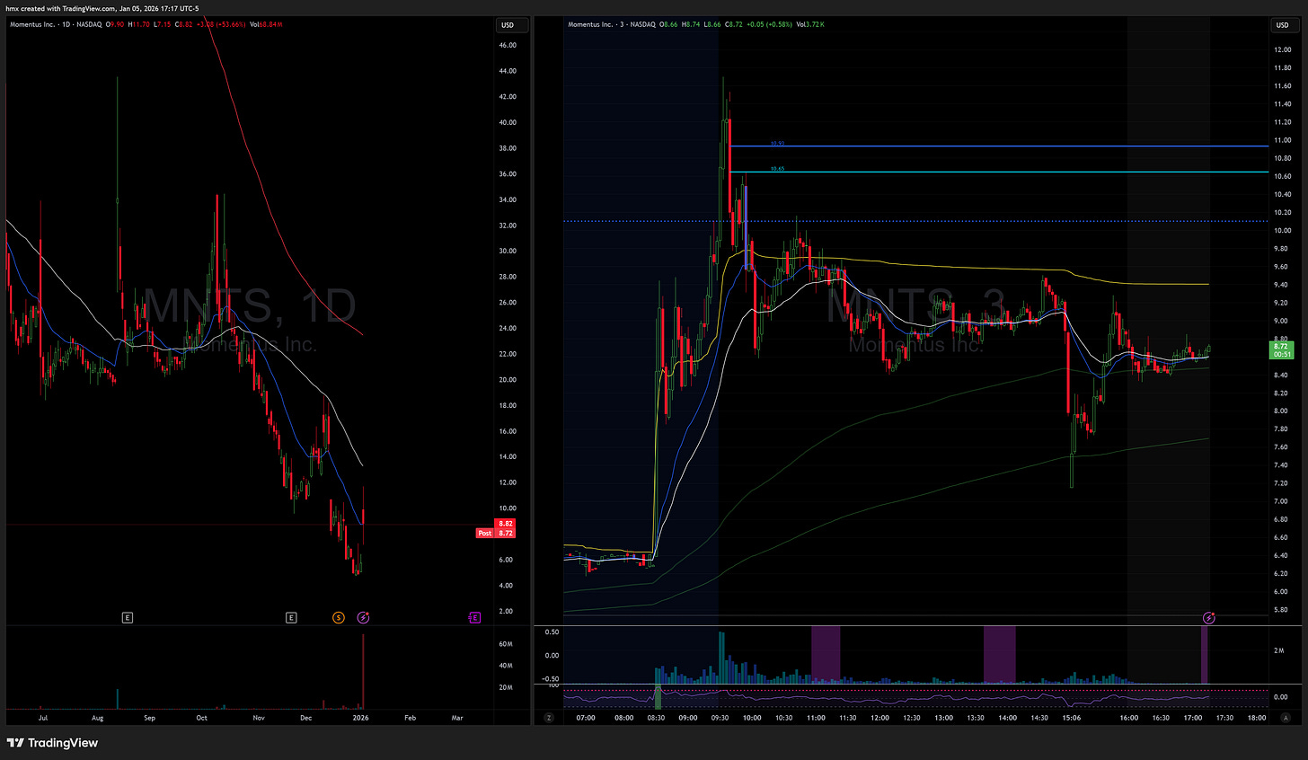 Later in the day, MNTS gave another really clean pullback entry right back into pre-market high. Again, I let it go. The reason was conviction. I didn’t feel confident enough to take full size, and I’m actively trying to stop taking “just to see” trades. If I’m not willing to take my normal size, it’s usually a sign I should be avoiding it altogether.