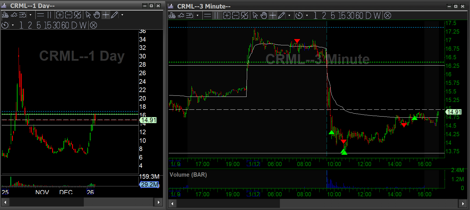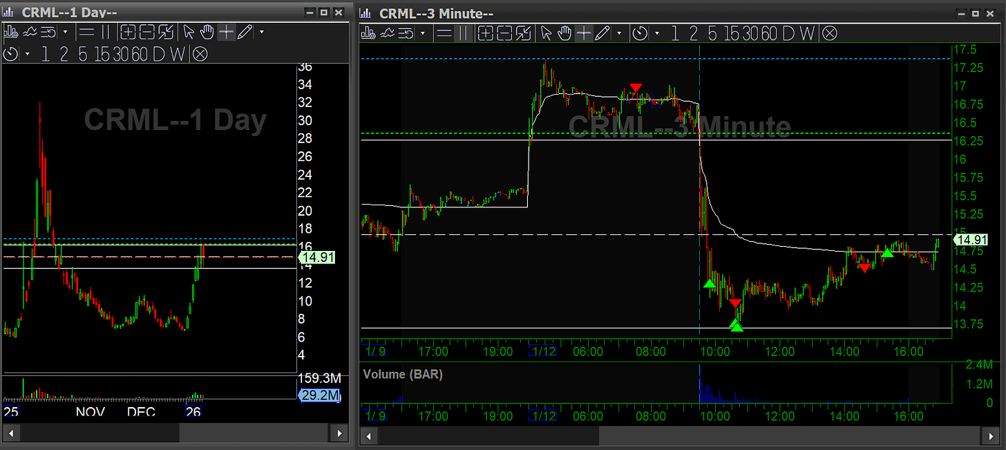 Pre-market CRML gapped up and showed signs of exhaustion. I thought it might play out similar to OKLO last Friday, so I took a short on what I call the last-ditch lower high. At the open it washed hard and finally put in a lower low, plus it broke the 15-minute opening range to the downside for the first time it’s entire run. I covered it into the previous days low and then began watching for bounces to re-short. Tried it once more after rejecting vwap but no follow through.