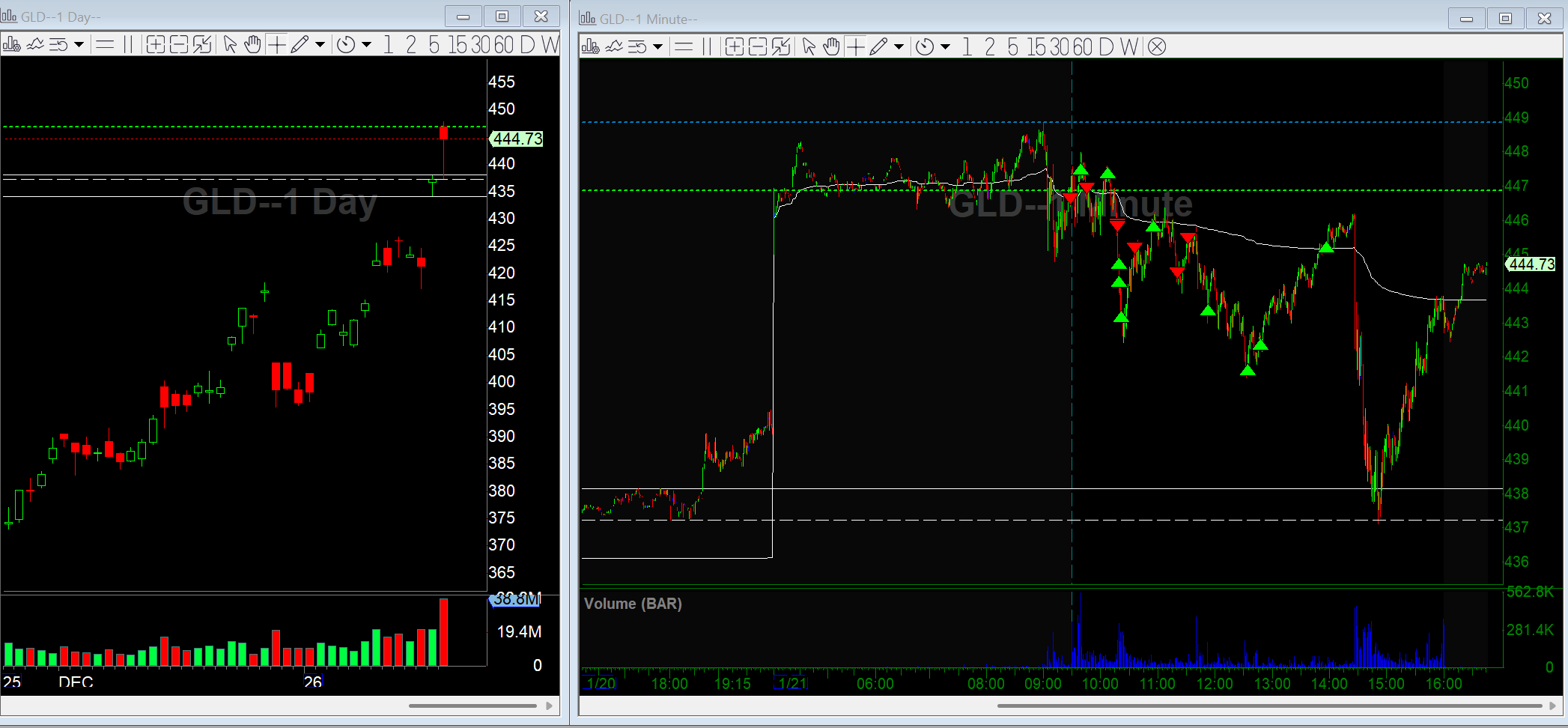 GLD was a main focus: shorted strength twice and caught the wash both times.