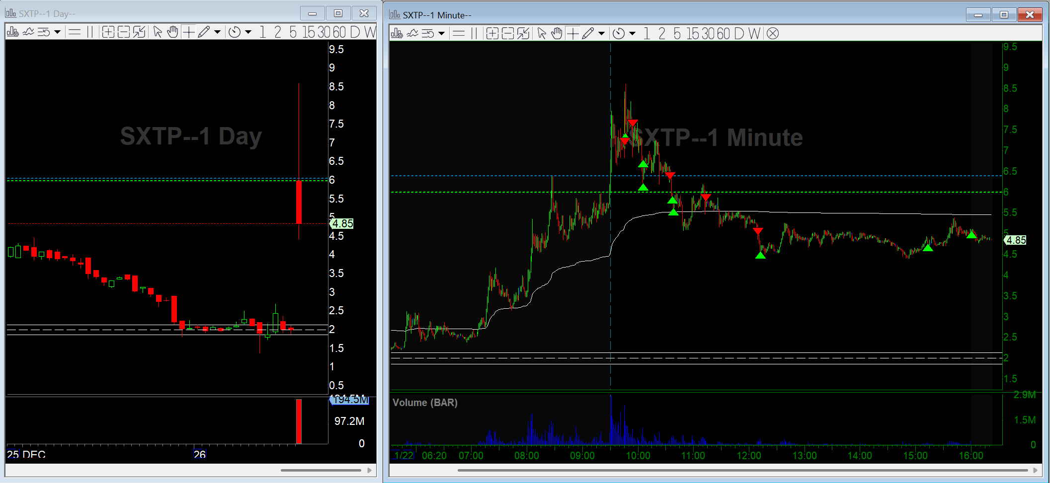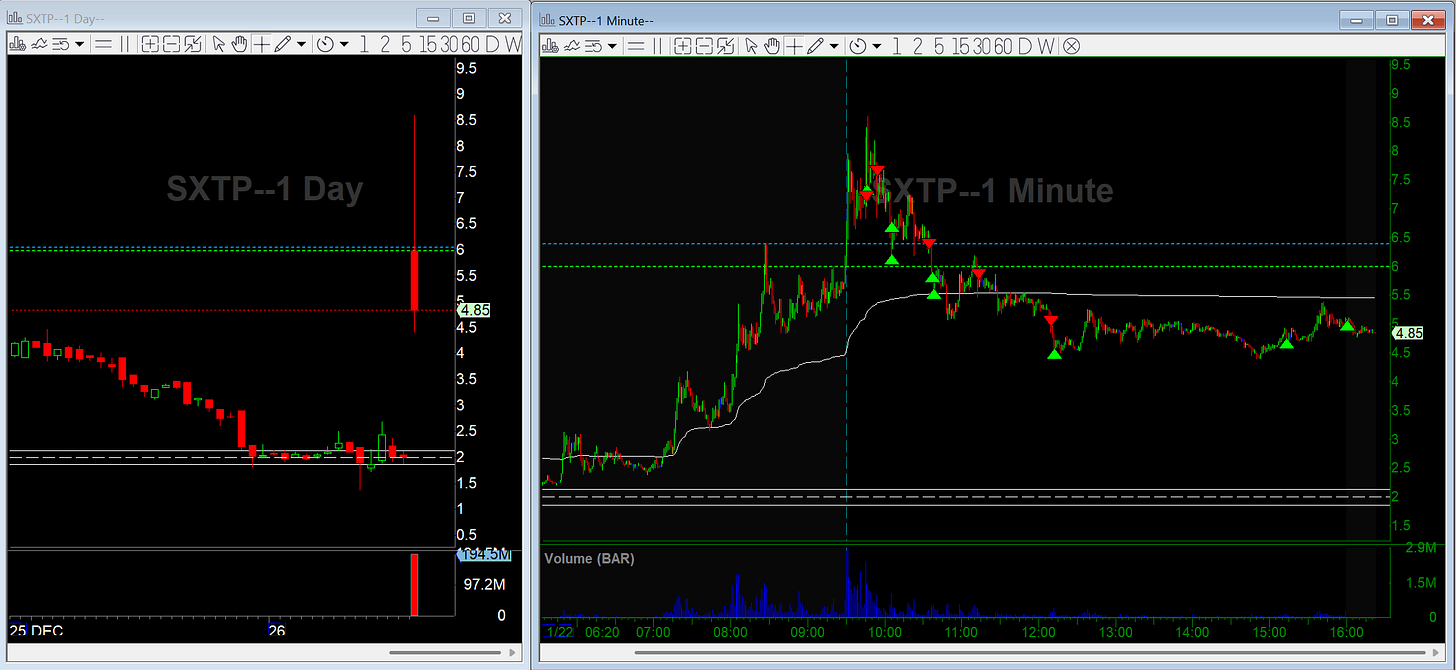 SXTP triggered an early primary short signal, but it was sitting over premarket highs with the 200-day just below. I took a starter but that’s not where I want to press size. I passed on the full add and waited for the 3-minute “final” signal per my system.