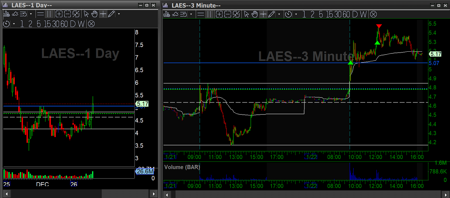 LAES: Started a swing long. Semis and defense are all strong themes right now and this one has it all. Added on the intraday breakout and sold a chunk into the push.