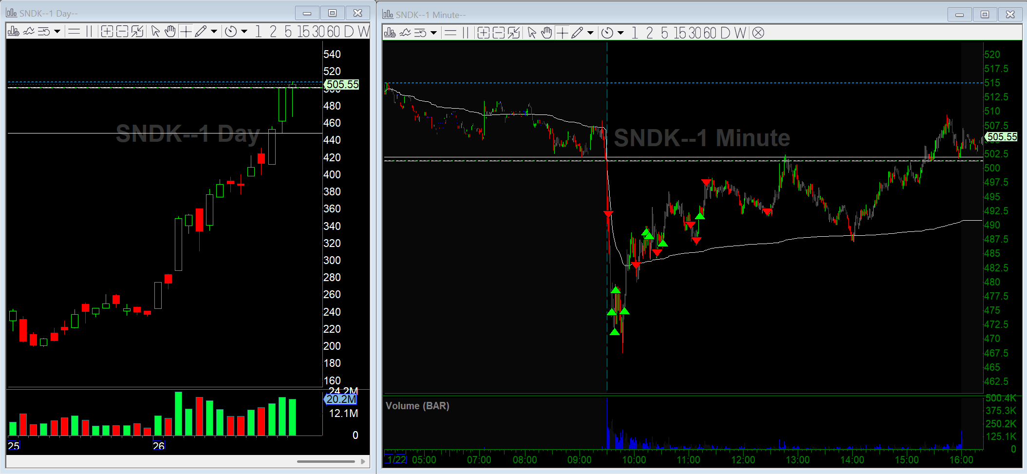 SNDK clean opening momentum short; then turned into a more complex but valid long setup.