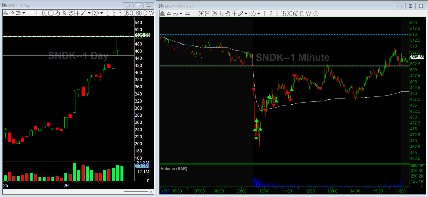 SNDK washed hard right out of the gates. On the daily it’s very overextended, but I was really looking for one more push intraday to get an A+ short. Instead, it failed immediately, so I took the momentum short and covered into the dips for a quick gain.