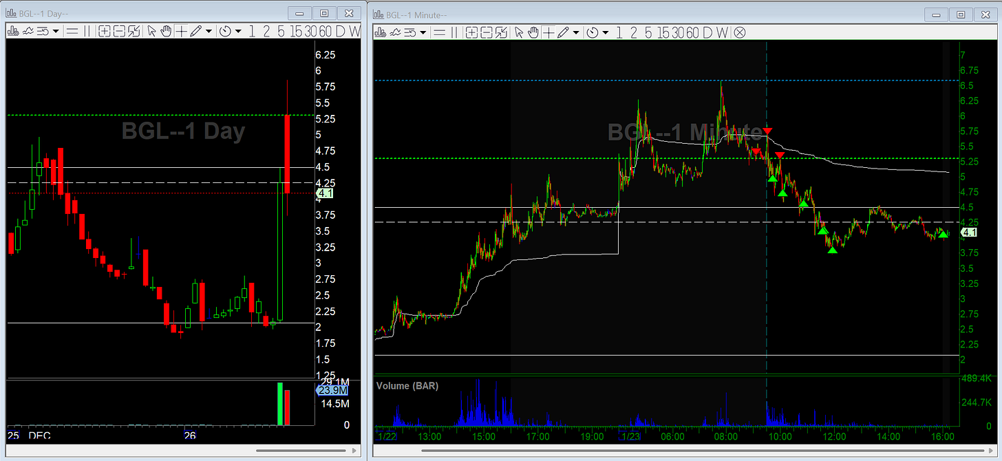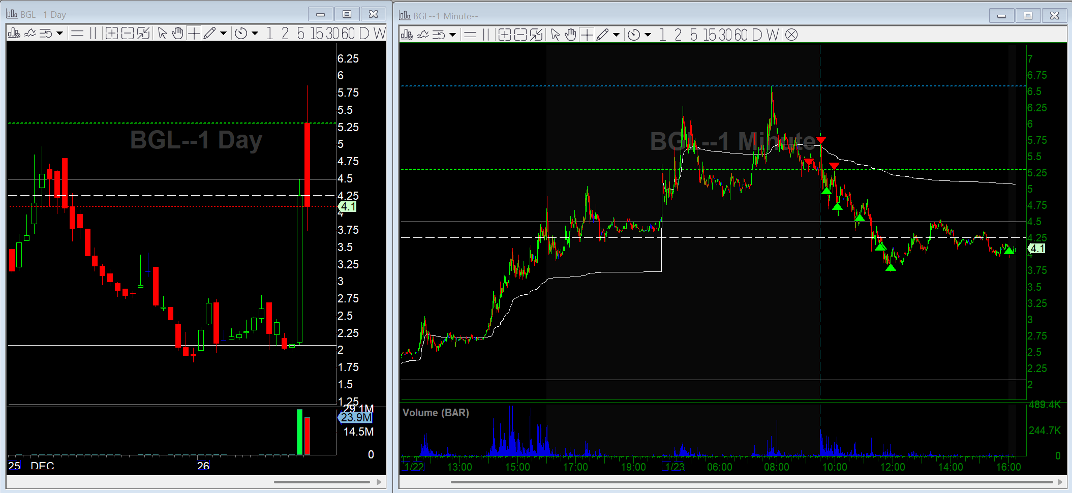 BGL was up roughly 150% in two days, riding the tailwinds of the gold move. It’s an African gold mining co but based in the Cayman Islands (hint hint). No fundamental reason to be extended that far, so the idea was simple: look for a fade once momentum turned.