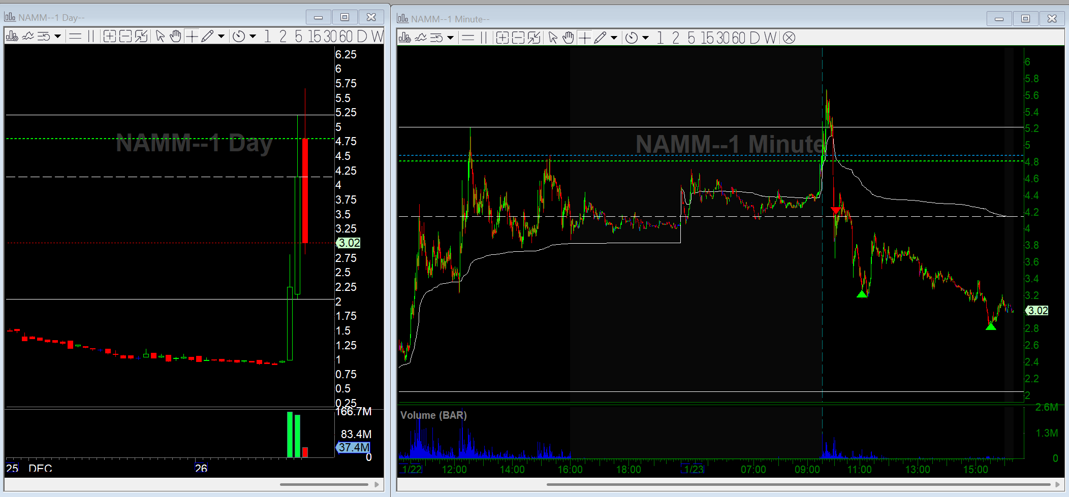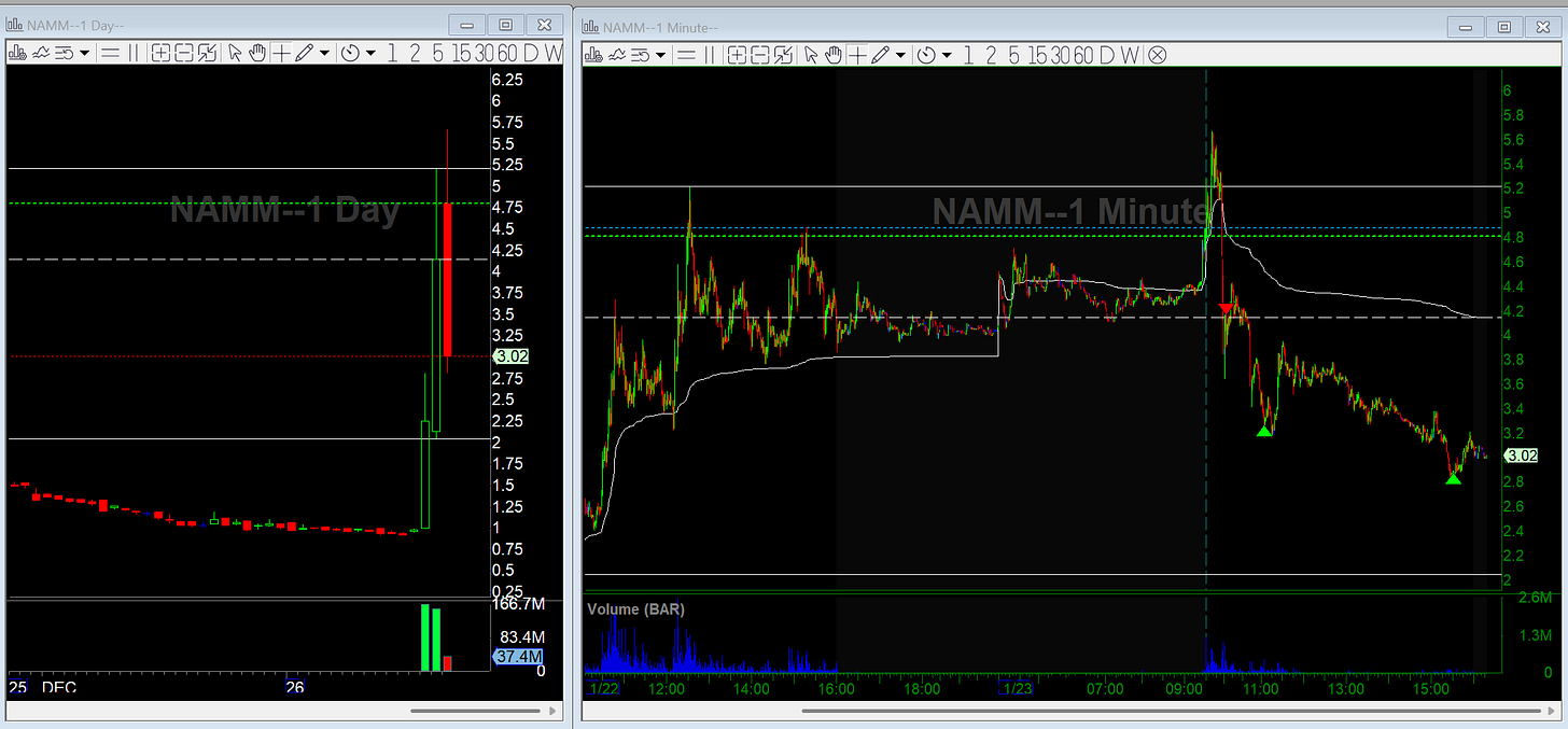 NAMM was even more extreme, up around 300% over several days. Unlike BGL, it had been consolidating at highs, so I wanted to see one more push before getting aggressive on the short side.