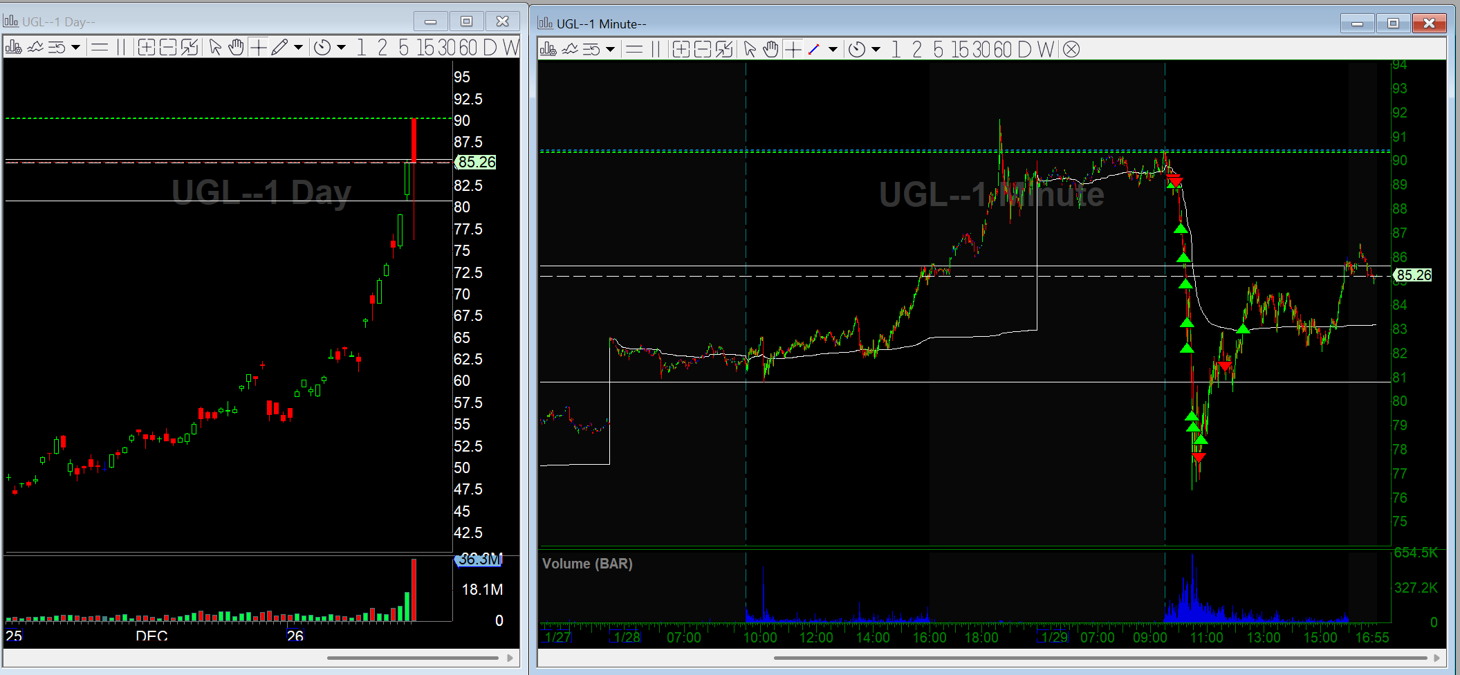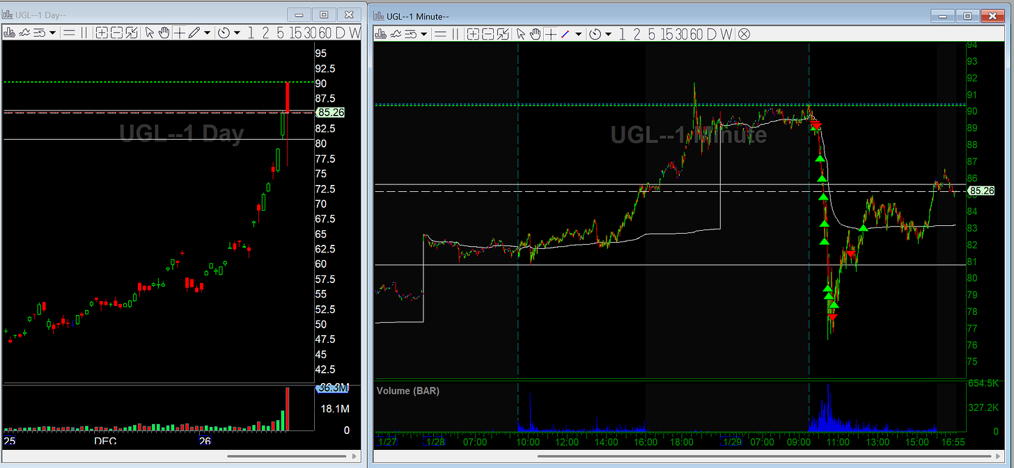 Once it began selling off and broke opening lows, I got short using UGL as the trading vehicle, risking high of day. After the first 15 minutes, price broke down hard and a classic downside waterfall selloff followed.