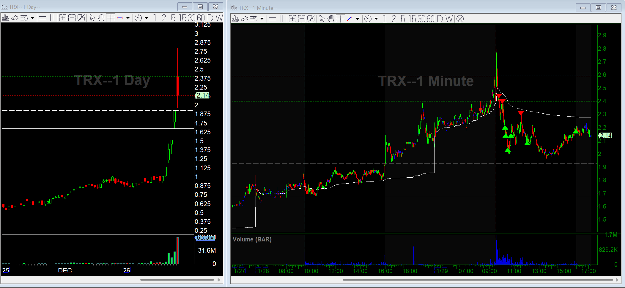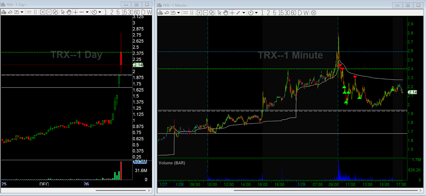 TRX is a gold-related small cap and a multi-day runner that was gapping up another 25% this morning. Not the biggest move overall but had the right sequence to be a good trade. I was looking to get short after any early strength and momentum started to fade.