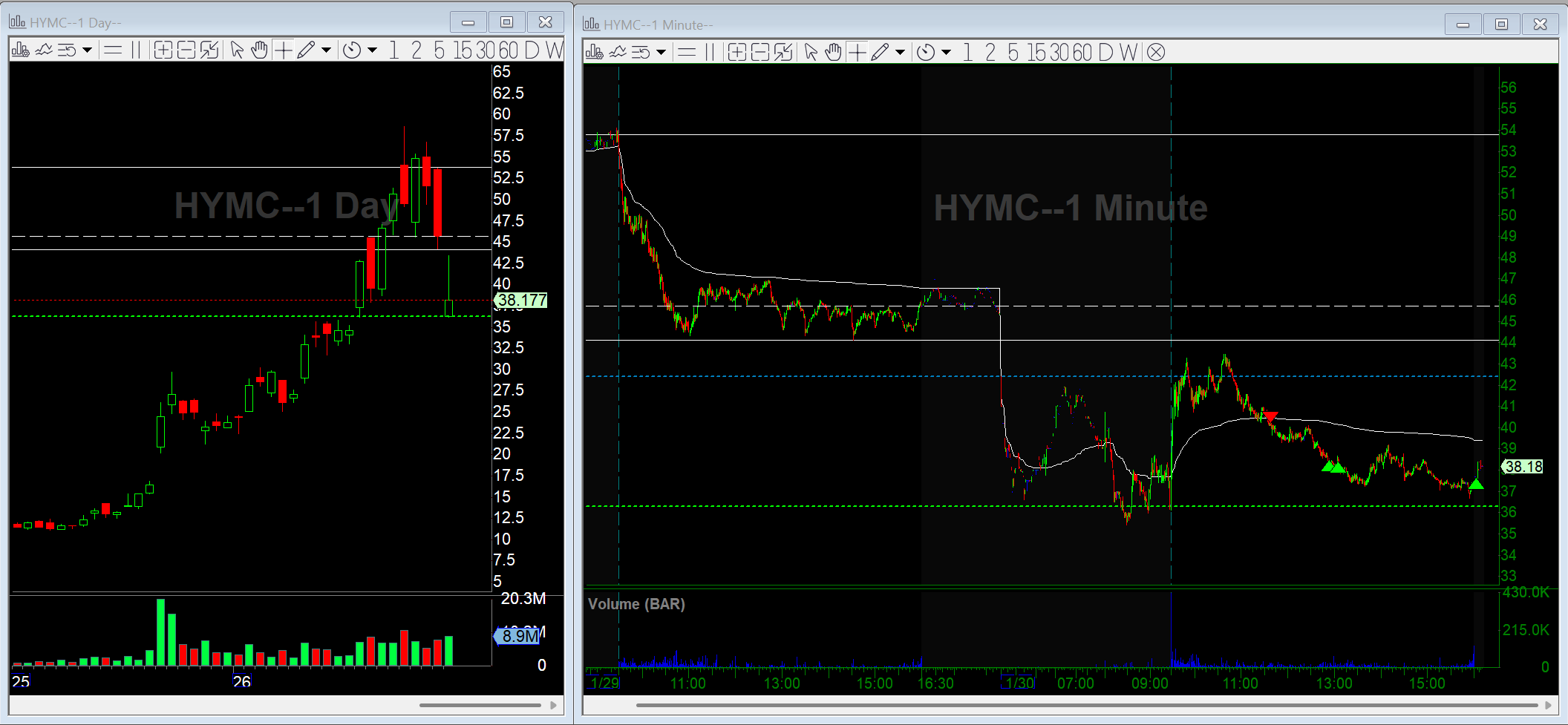 With gold and silver getting crushed, HYMC stood out as still green and lagging the downside move.