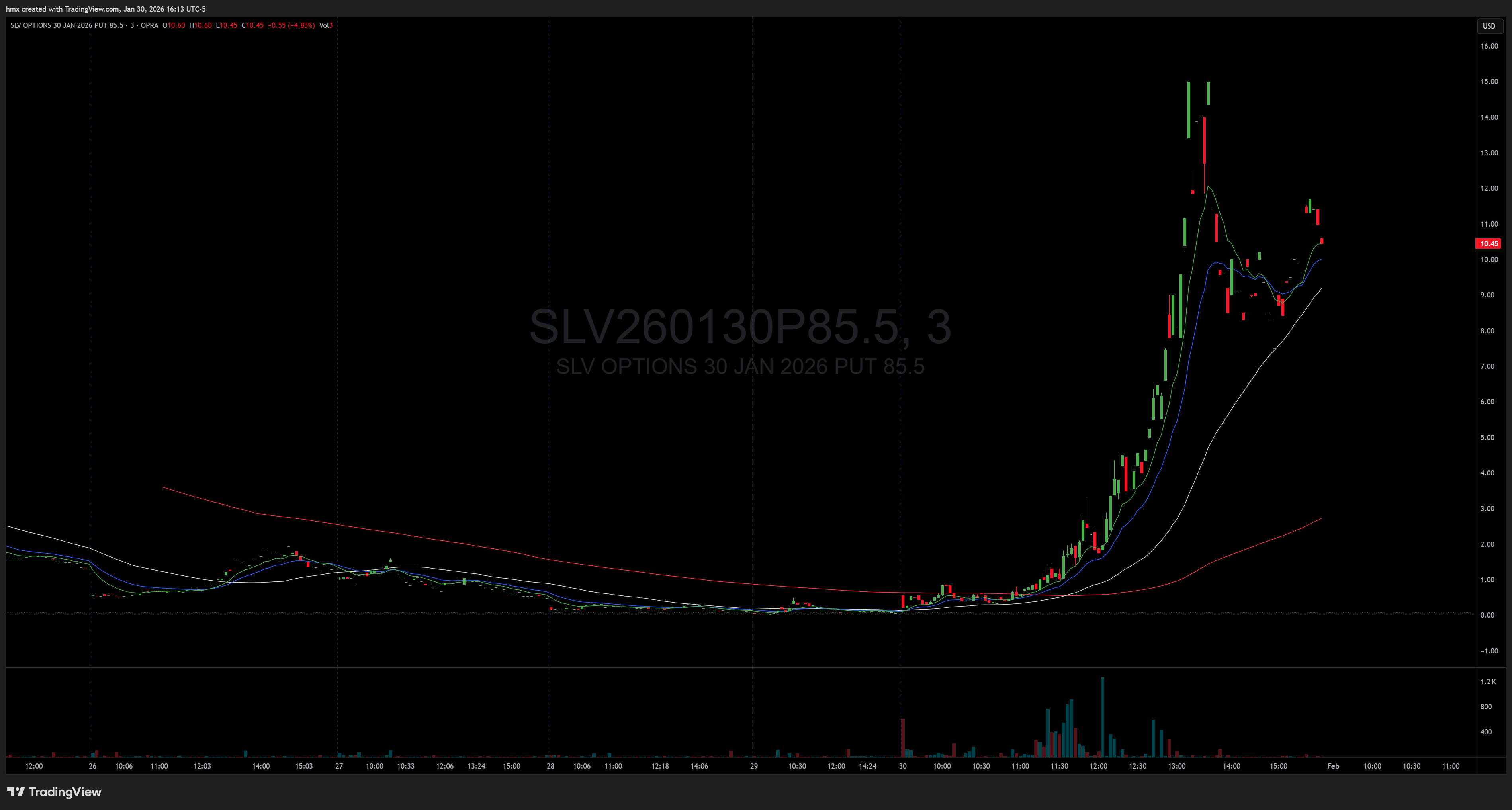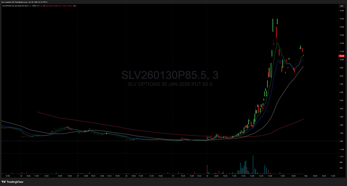 Instead, once morning lows broke, both names trended steadily lower all day. Silver fell over -30% making a historical move! I scalped some 0DTE puts on SLV but kept it small and defensive. The 0DTE’s went insane, some moving up over +6000%.