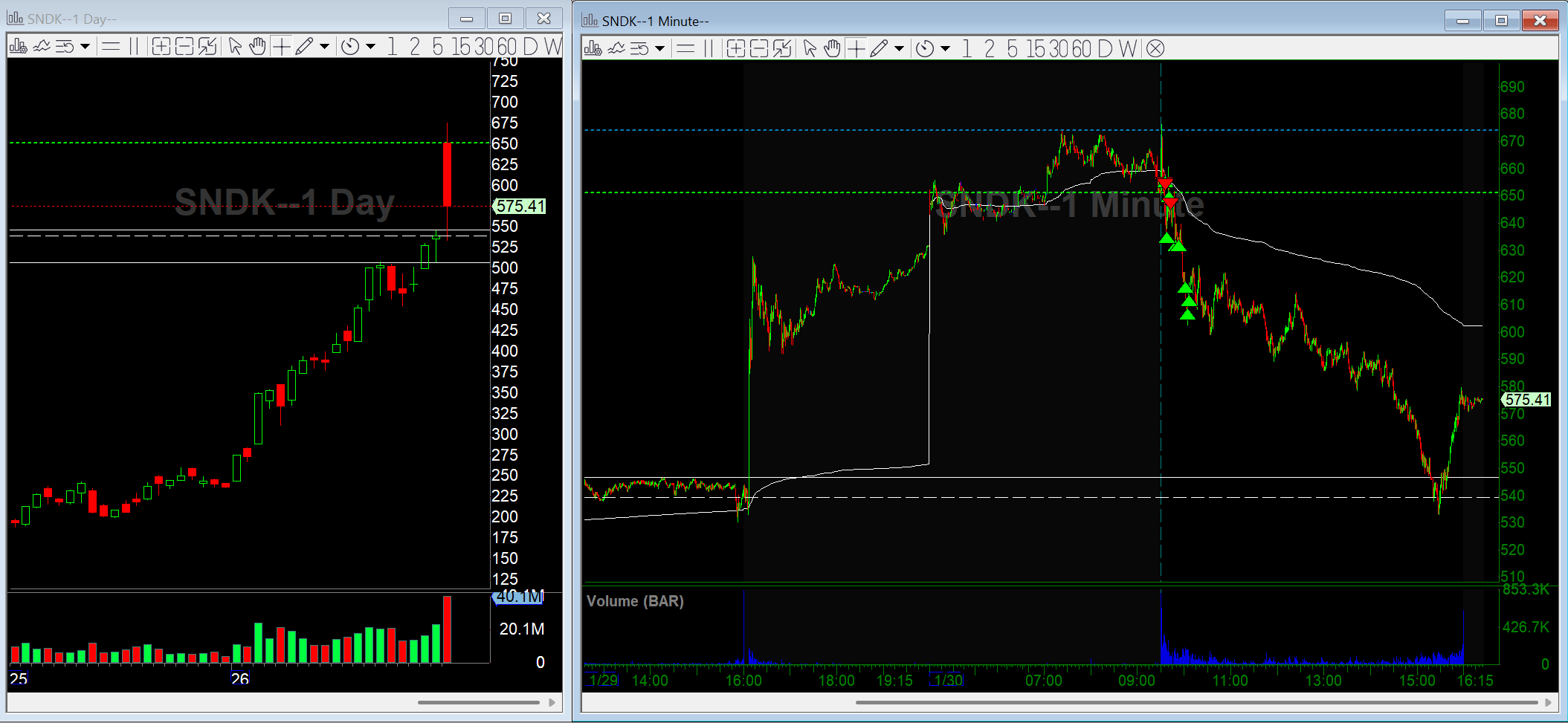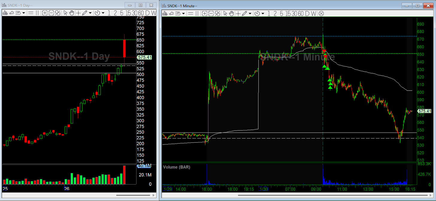 SNDK gapped big on earnings after an already extended daily run. My expectation was profit taking, so I was focused on shorting failed strength rather than chasing.