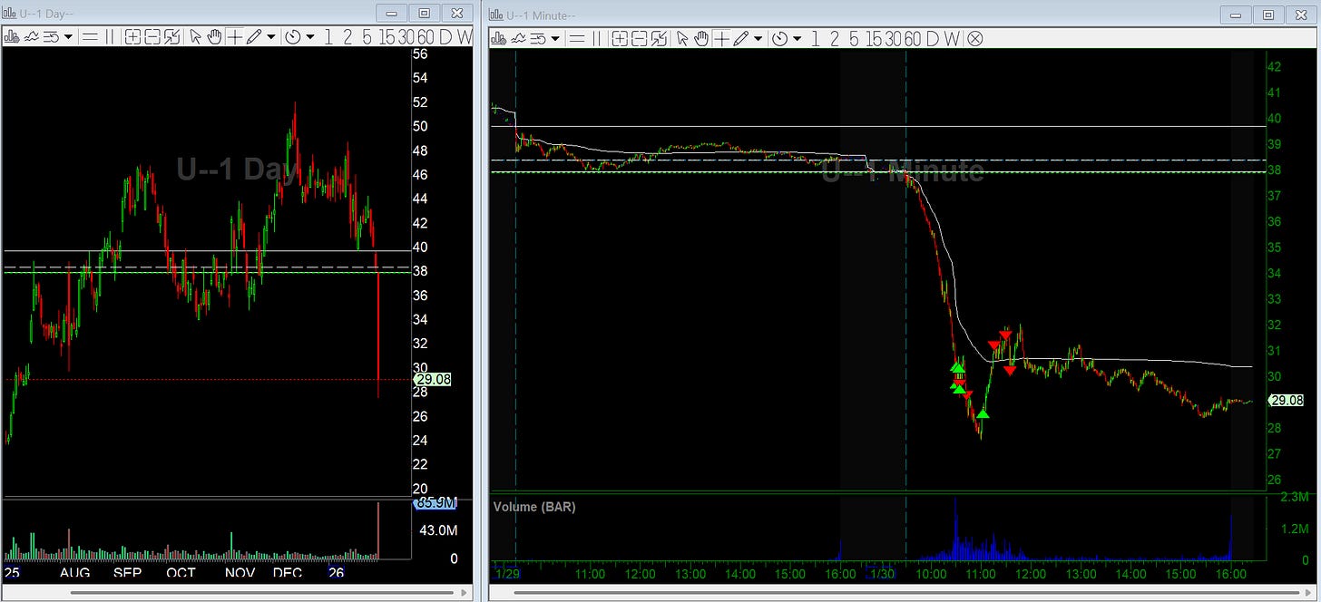 Unity started capitulating on news around Google’s launch of “Project Genie” and the tape picked up quickly. I don’t trade bounce setups often, but I saw exhaustion potential.