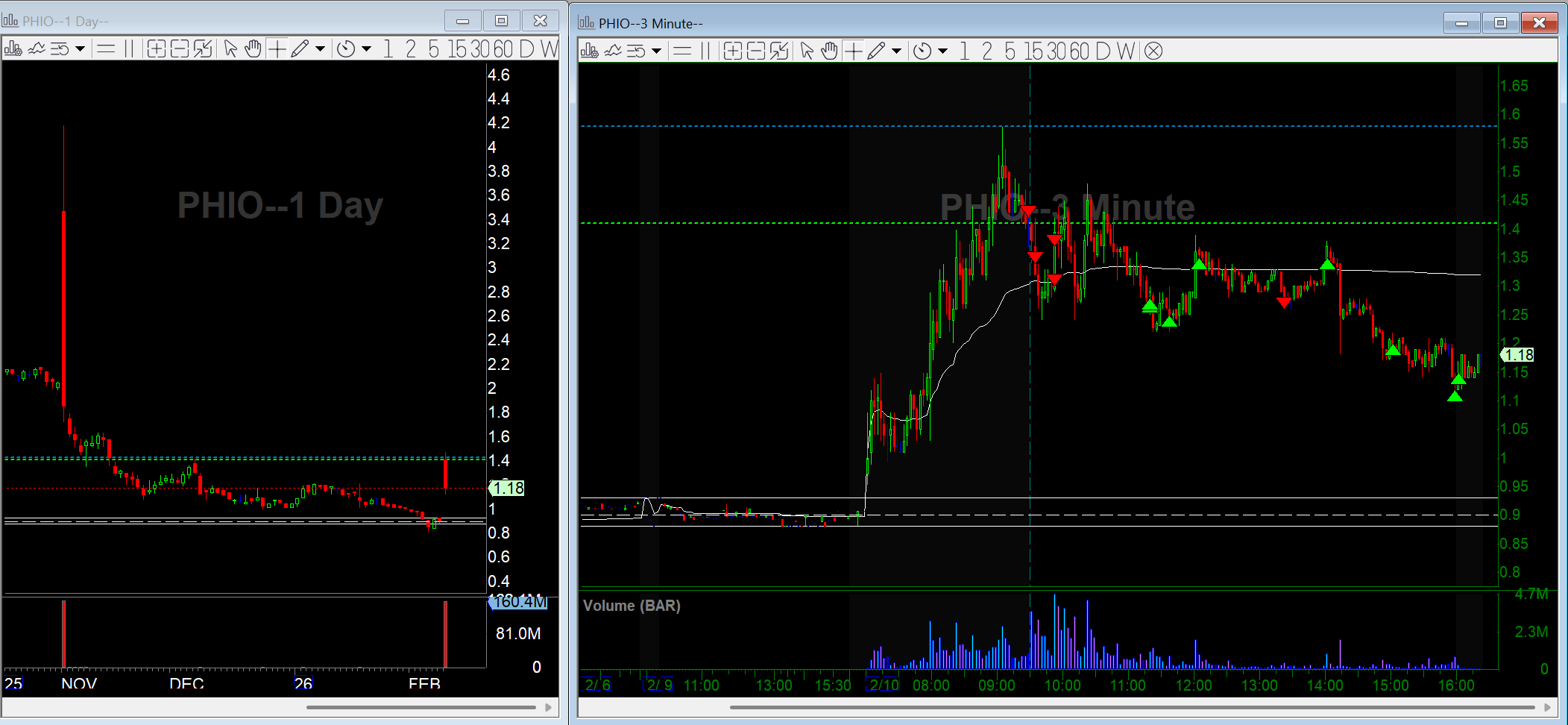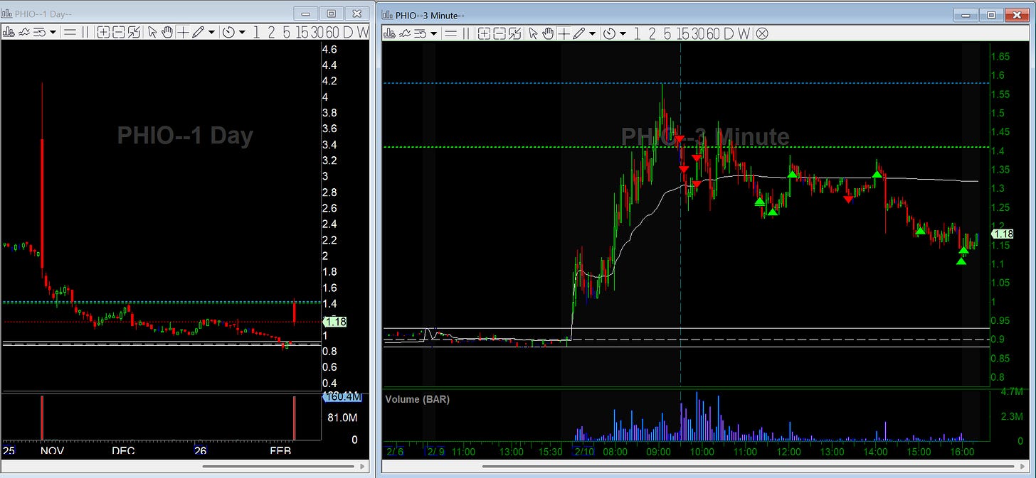 PHIO gapped about 55% on phase 1b news and fit the profile of a historical fader with frequent dilution, so it was my main small-cap focus. I got short a starter in premarket, then sized up after the open.
