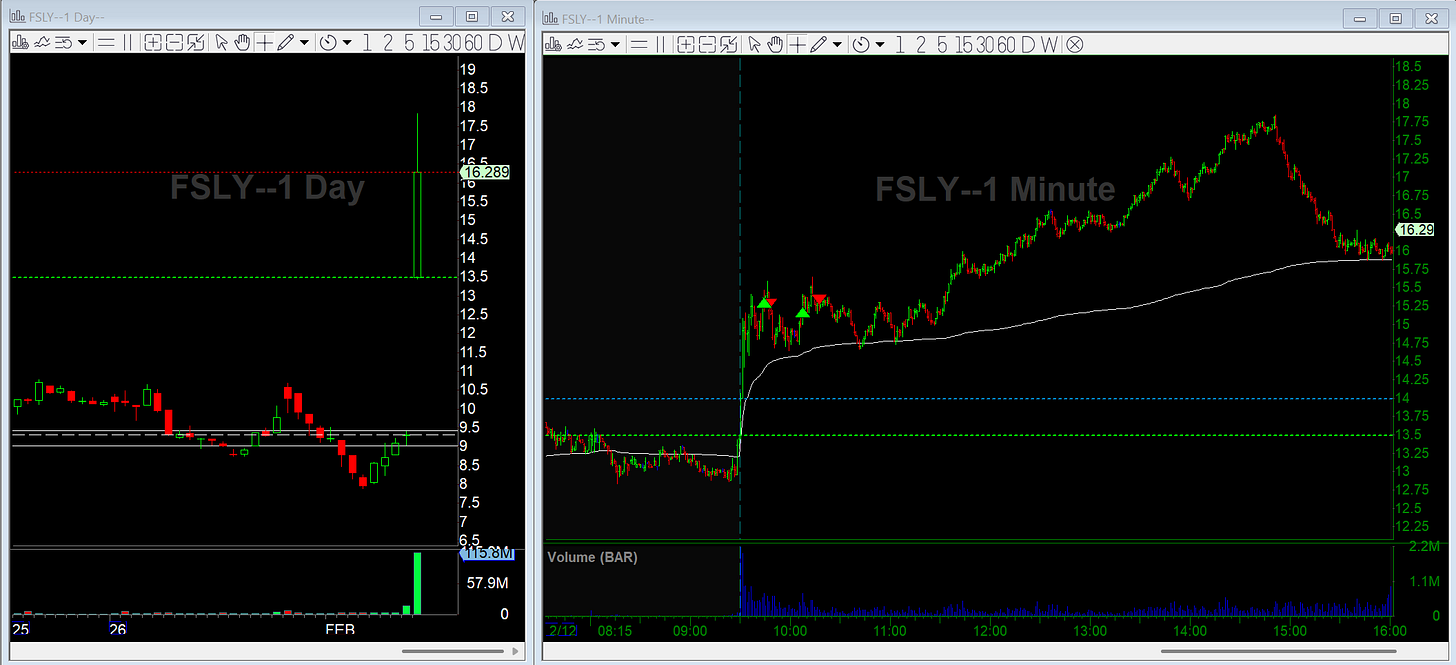 FSLY gapped up over a huge base on earnings. Some would call this an episodic pivot (EP). I missed the long right out of the gates, which would have been the best entry. Later I tried getting long twice, but I cut both quickly. It was already up around 60%, which is a big move for that market cap, and I felt like it needed one more shakeout before going higher.