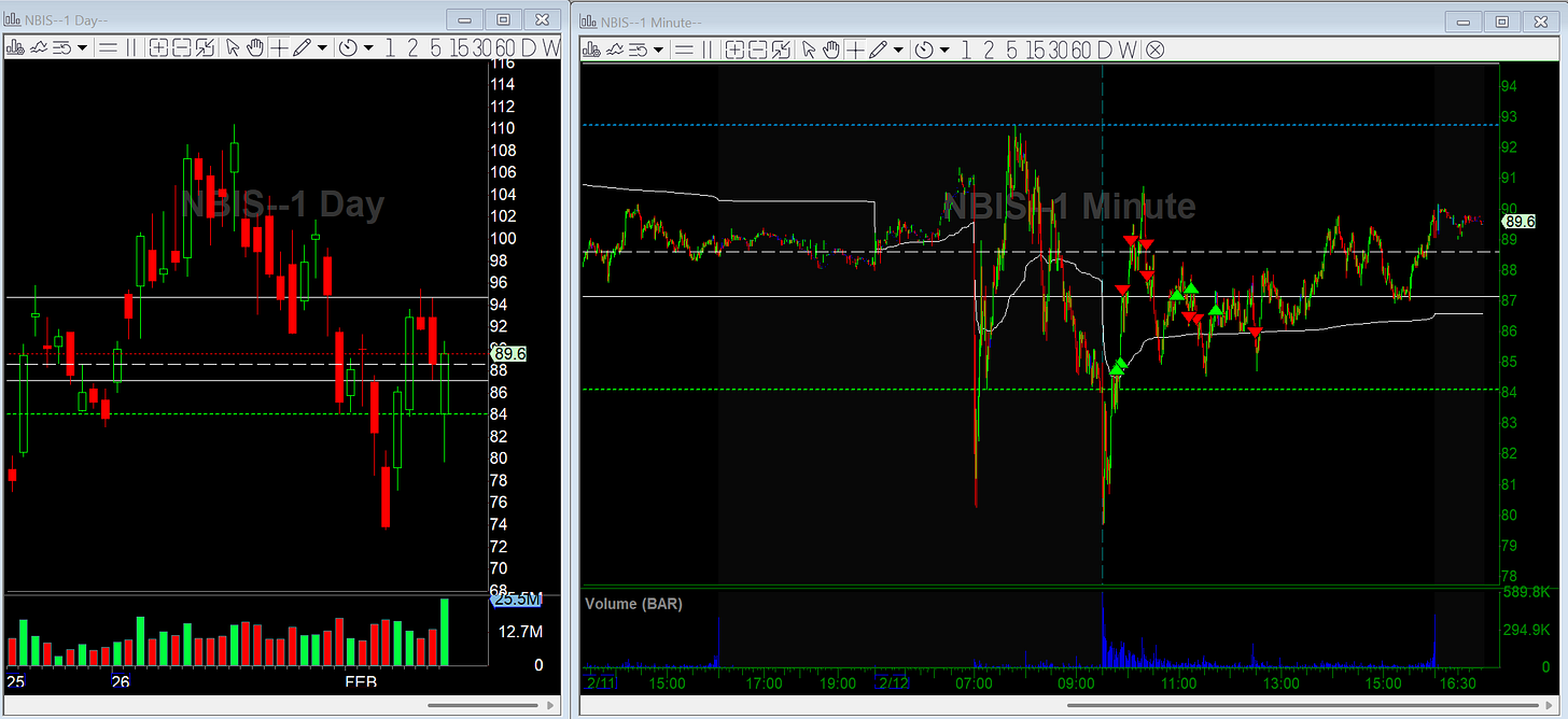 NBIS gapped down on earnings into major support with the 200SMA just below. It dipped off the open, then started to curl back up. I went long over the high of day, leaning on the idea that data center names have been showing relative strength even in a weak market.