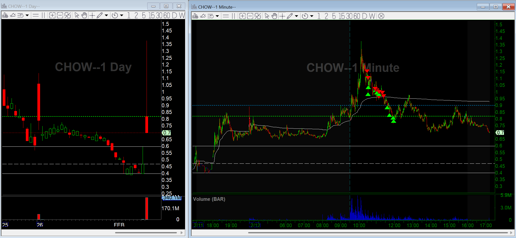 CHOW was the small-cap du jour and it squeezed out early shorts as it went parabolic. Once that blow-off move started to stall, I got short. I didn’t love that $1 and pmh were right below, but after that squeeze, the risk-reward made sense.