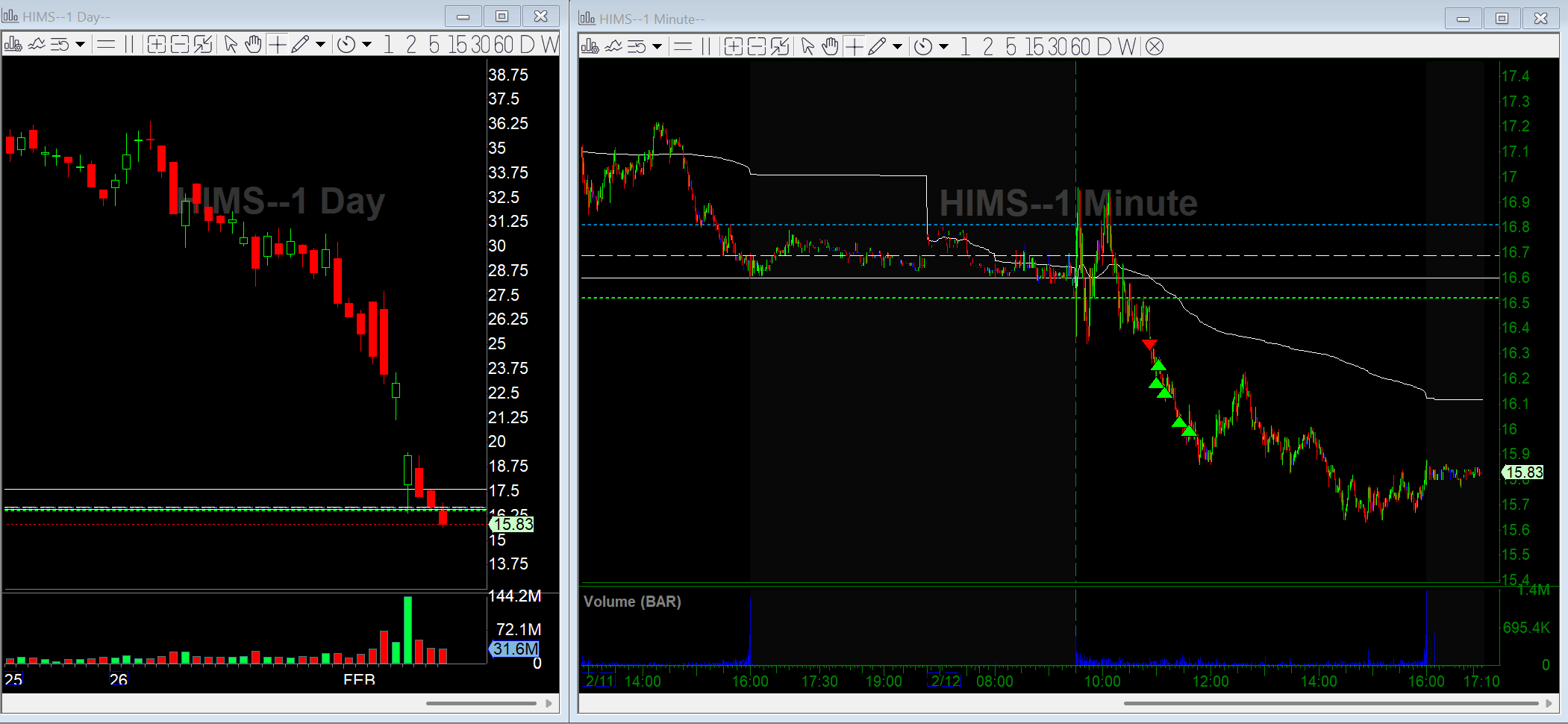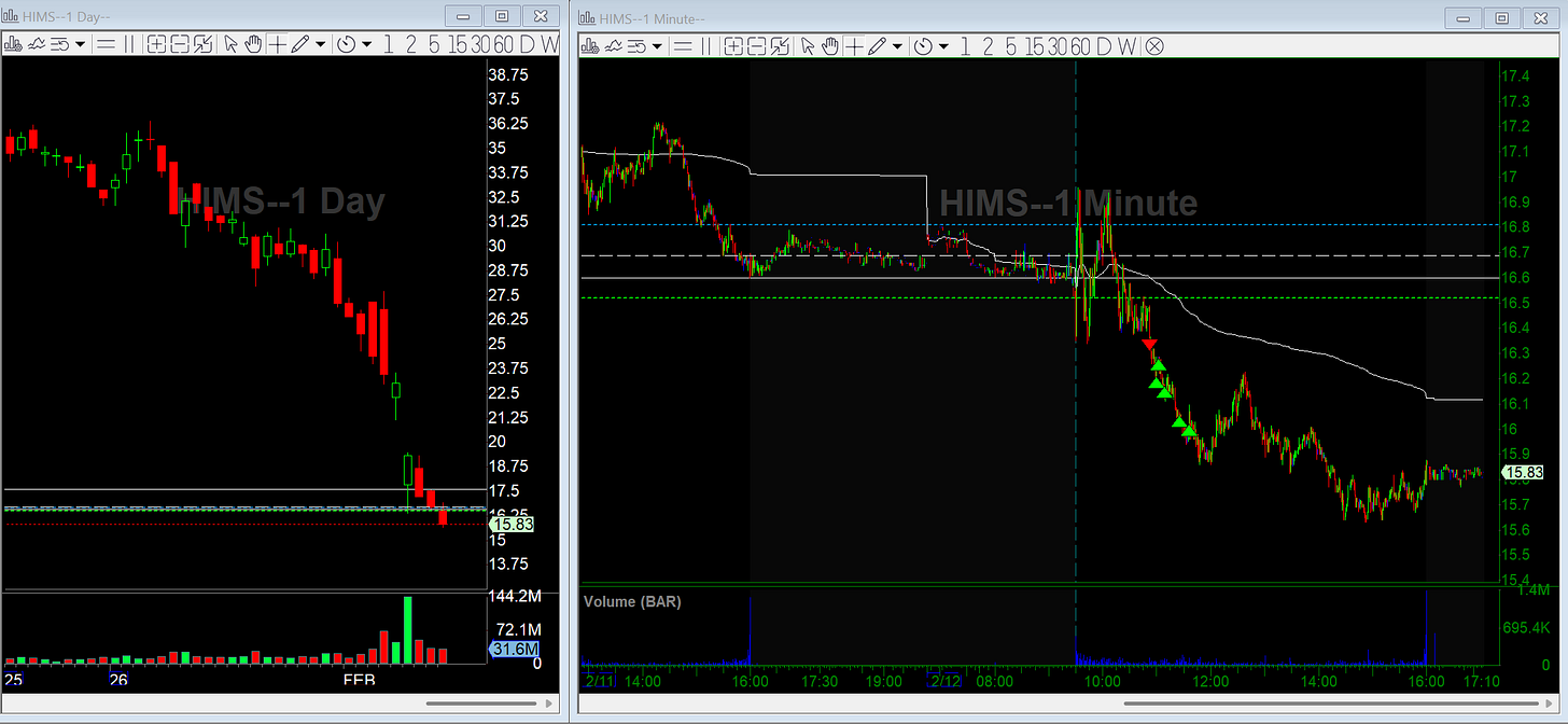 The broader market started selling off hard, and HIMS has been trending down on the daily for a while, plus it had a negative catalyst earlier in the week. I got short HIMS on a break of the low of day.