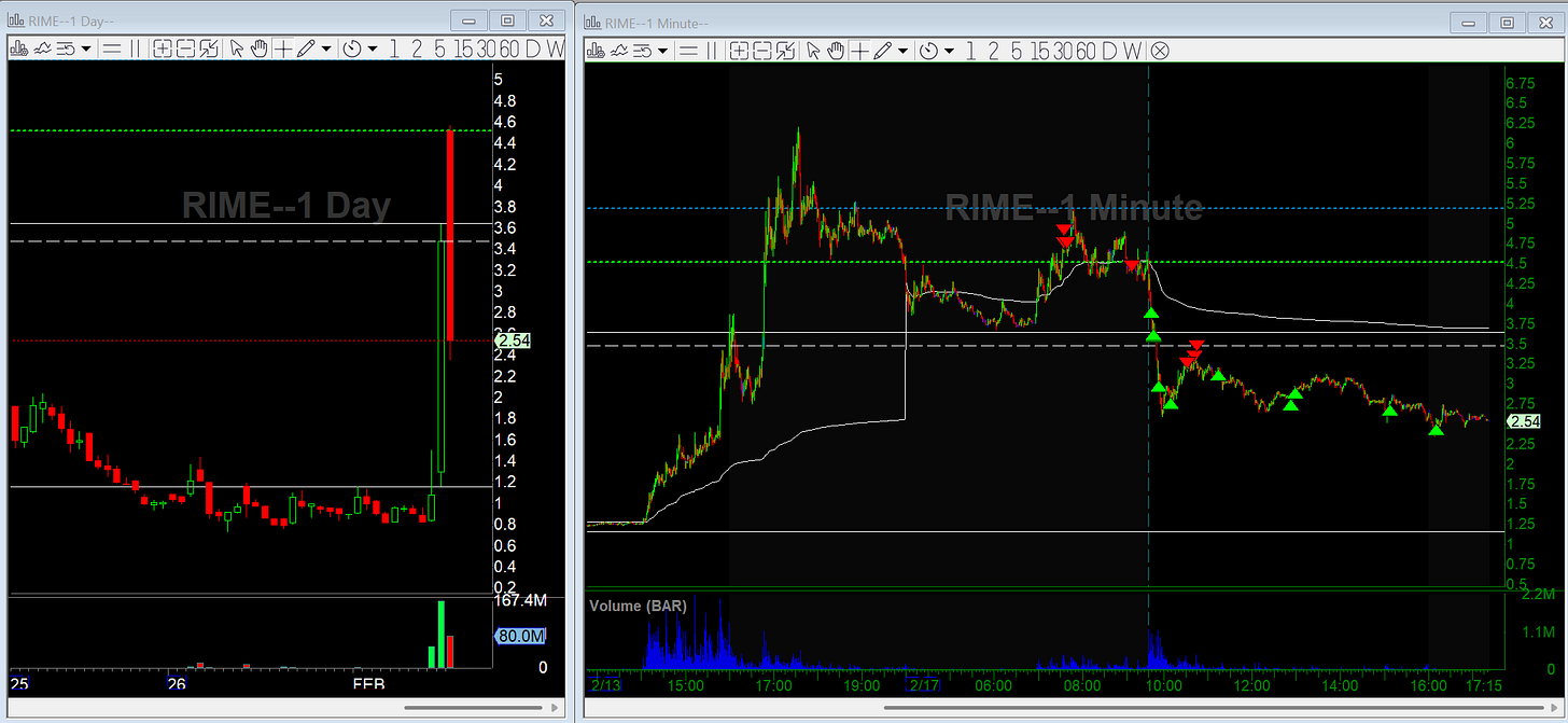 RIME was technically a D2 gap up, but also day three of the broader move. It had a blowoff move in post-market last Friday and was gapping again this morning, but still below those post-market highs. I got my trigger to get short in premarket and look for a fade.
