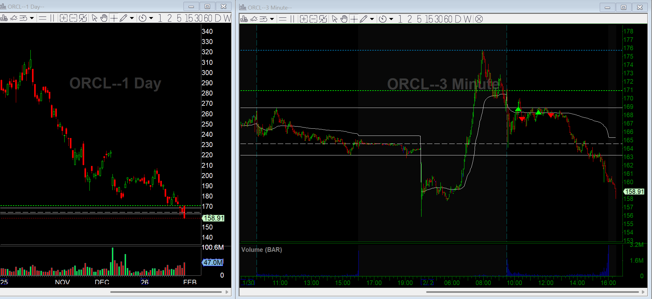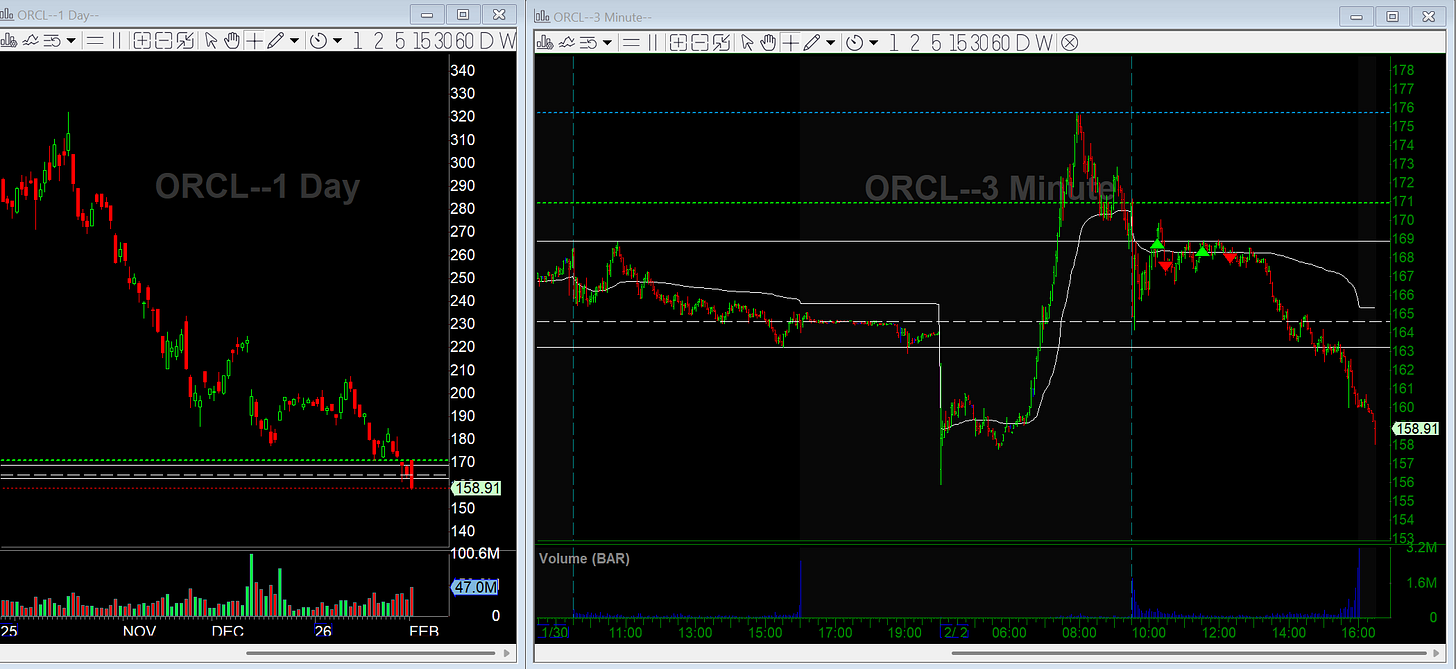 I went long ORCL over VWAP after it announced a $50B raise via debt and equity to fund cloud infrastructure. The daily chart is pretty beaten down, so I liked the odds of a relief bounce. The trade made sense on paper, but price never followed through. I got stopped out and moved on. No issue here, just another reminder that news plus a logical thesis doesn’t guarantee execution. Good thing I didn’t stay wrong because it sold off hard into the close.