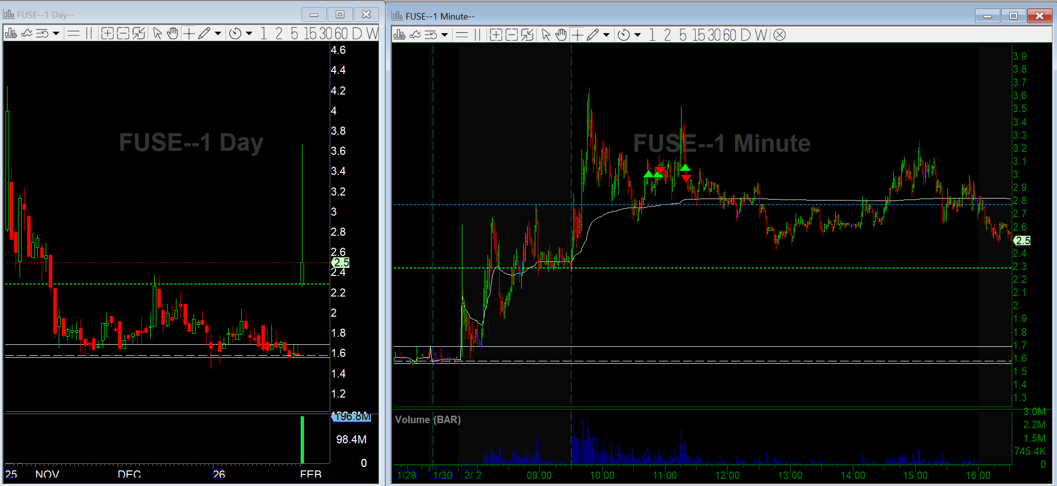 FUSE was doing big volume and holding pre-market highs, which put it on my radar. I got long on the pullback. It pushed up to highs but stalled at 3.50 and started rolling over. I stopped out around breakeven. In hindsight, this was probably a boredom trade. Small caps were slow this morning, and I forced involvement instead of waiting for something cleaner. Not costly, but still a good note for the journal.