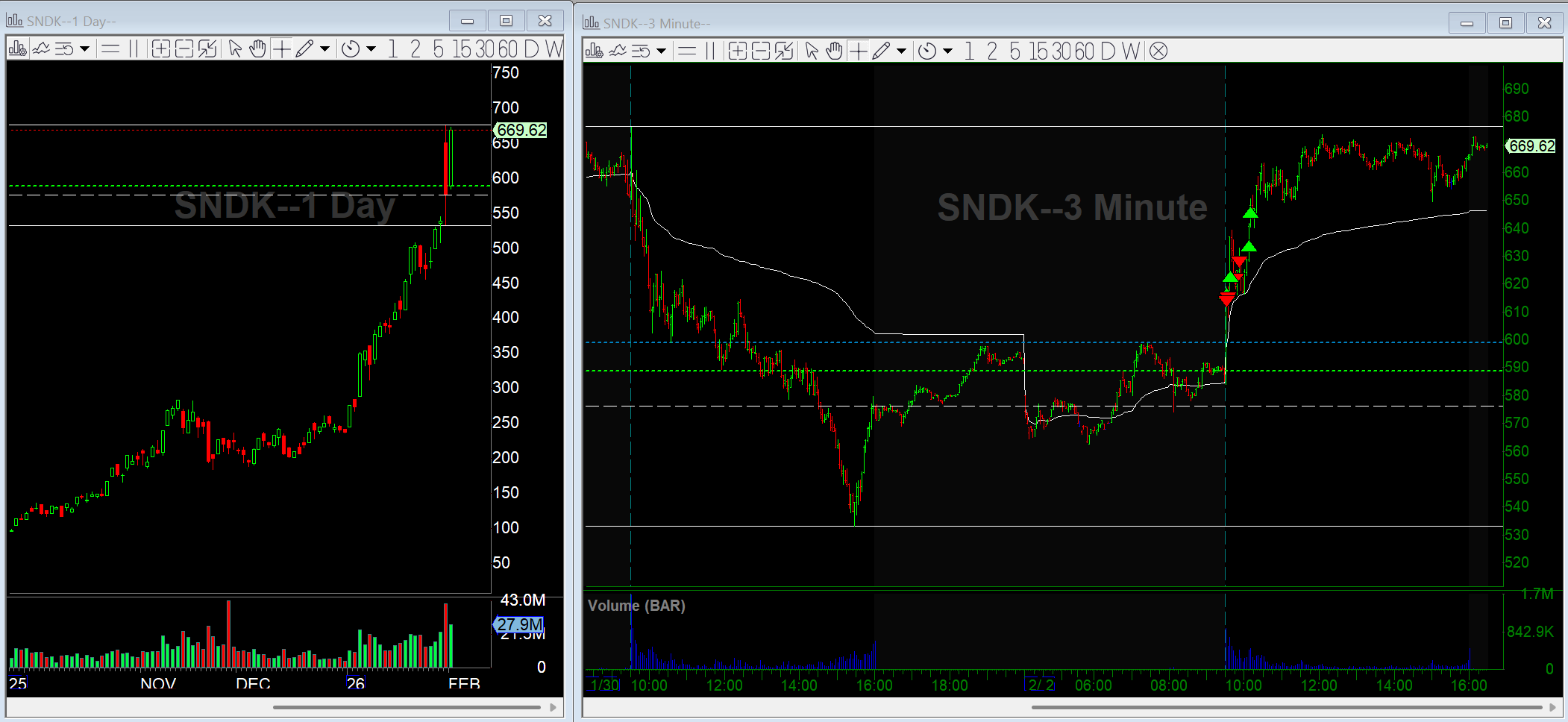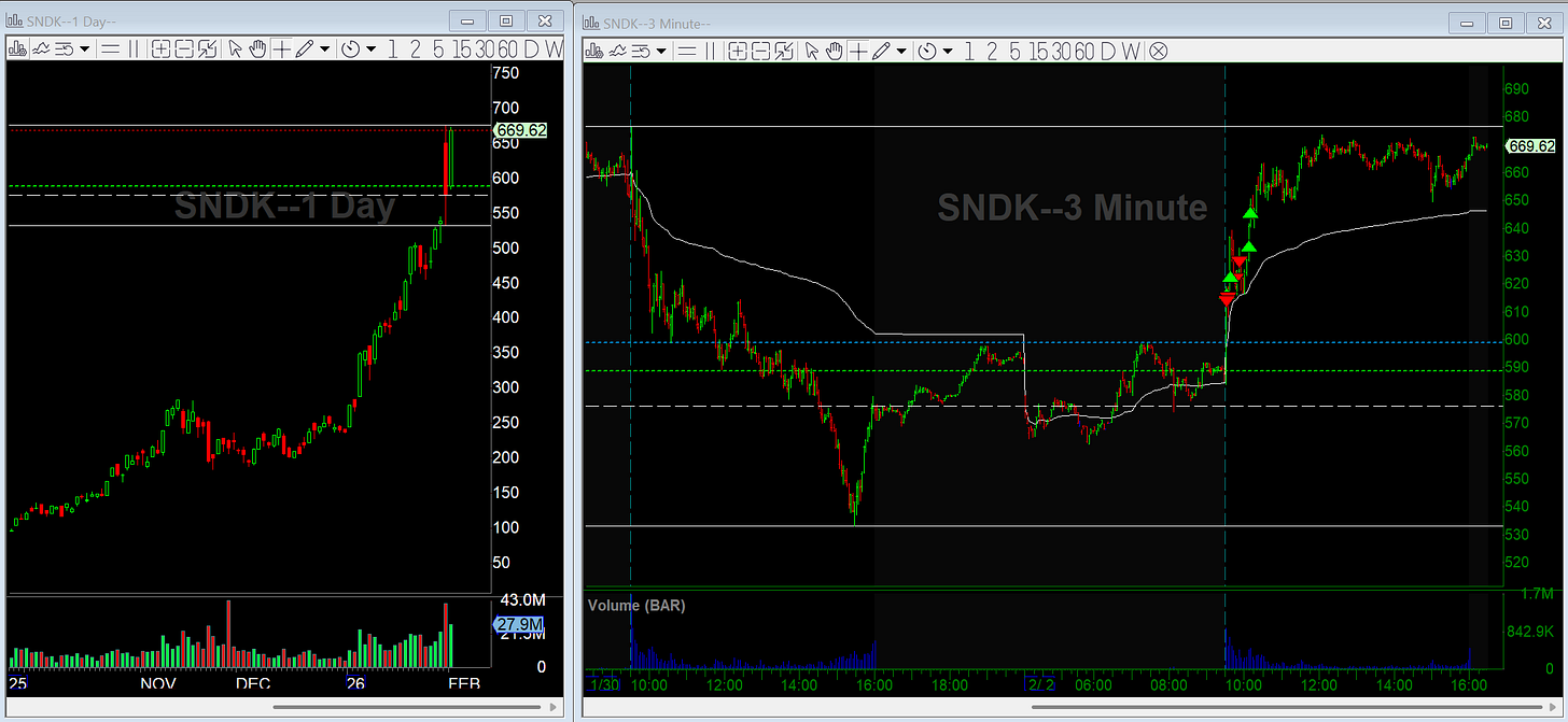 I got short SNDK on the opening bounce into prior levels after Friday’s earnings selloff. I felt it could have a continuation day to the downside. That didn’t happen. I got stopped out fairly quickly. Looking back, I was just wrong on the read, and that’s fine. Risk was defined, the stop was respected, and I didn’t hang around hoping. Being wrong is part of the job. Staying wrong is the real mistake.