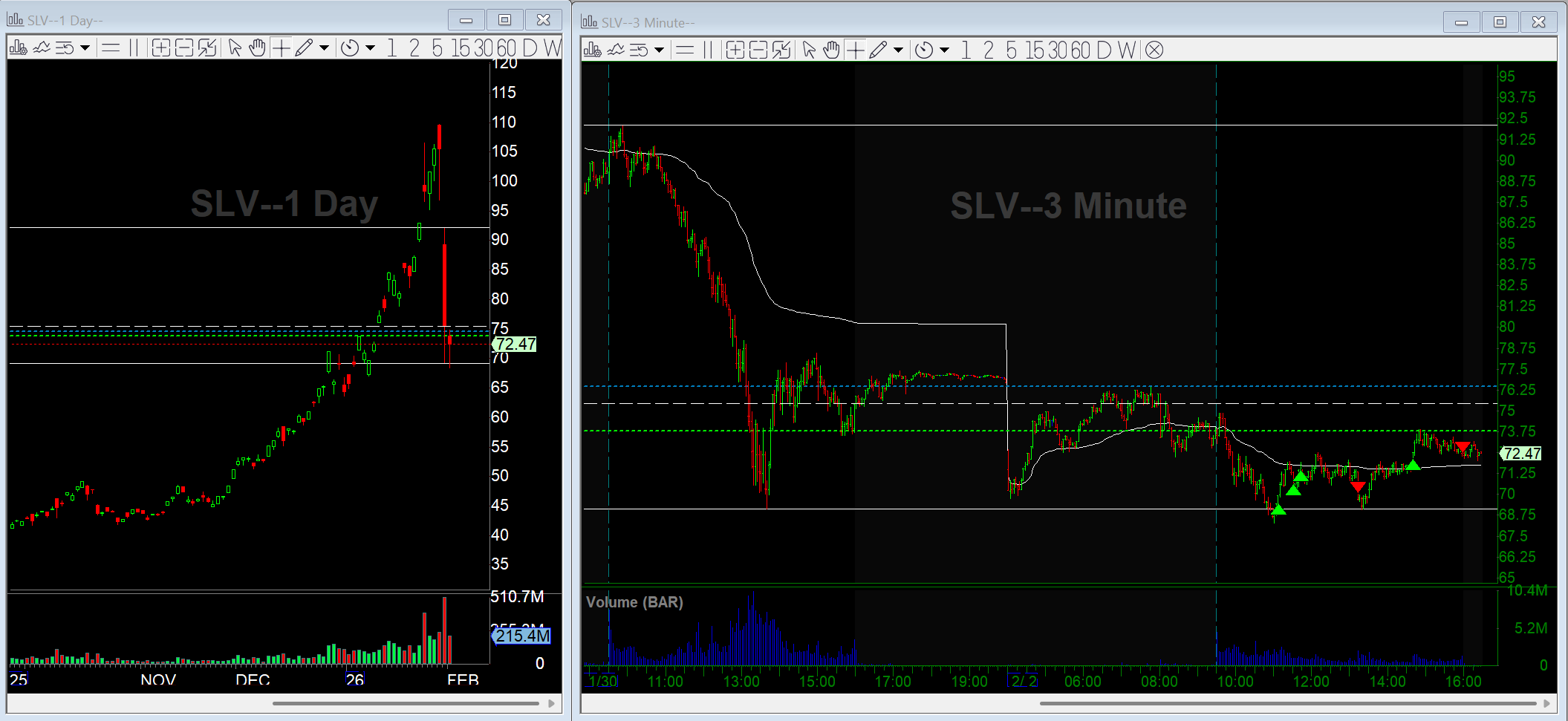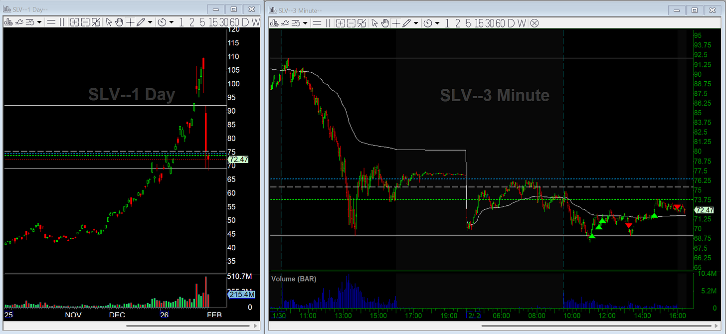 Later in the afternoon, SLV consolidated around VWAP and then broke back over 72. I added back on the reclaim and also sold some Wednesday put spreads to take advantage of the slow, grinding bounce. Those spreads were up nicely into the close, and I’ll look to sell them tomorrow. As far the position in commons, I sold a small piece at the close to manage risk and held the rest overnight.