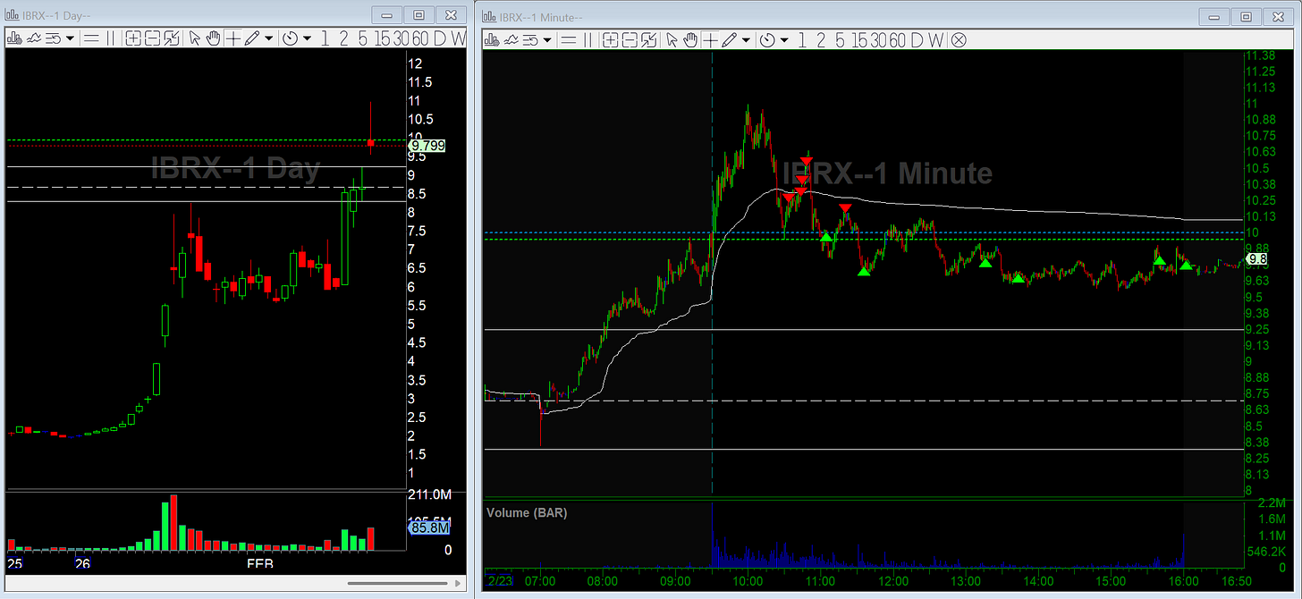IBRX was on my Sunday Watchlist. It gapped 13% overnight and ripped another 10% off the open and started to look extended. The 10.60 breakdown was the clean short, but I missed it. It flushed hard and I wasn’t going to chase that.