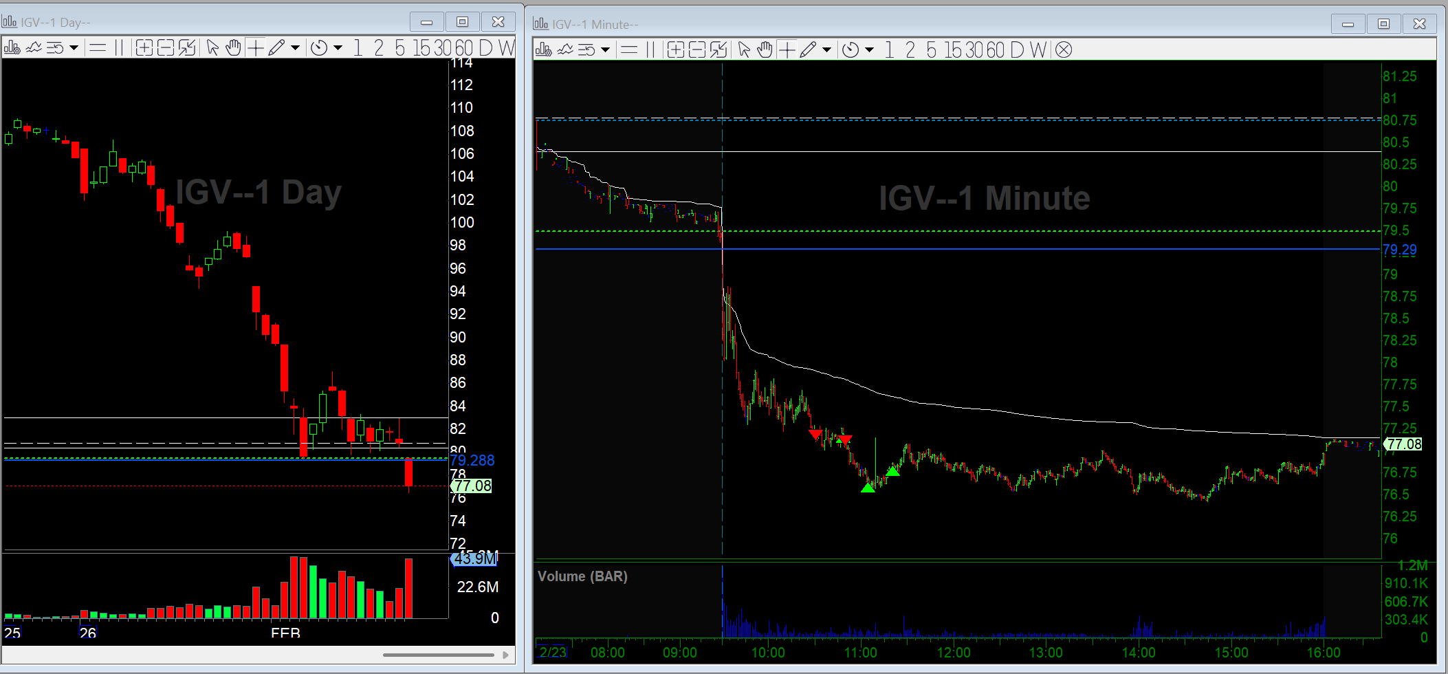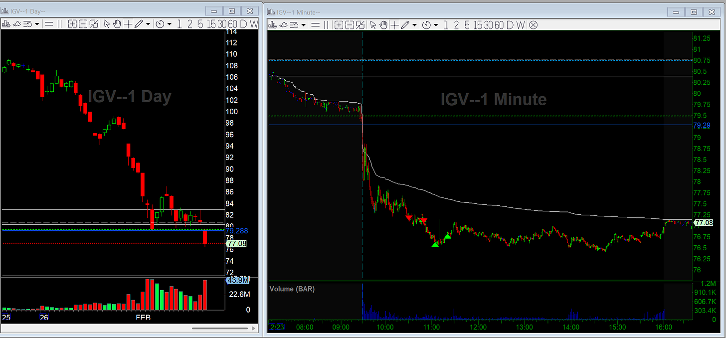 IGV gapped down and triggered the daily bear flag almost immediately. I didn’t chase the first flush. Later, it consolidated near 79.30 and the tape felt heavy. I got short on the breakdown and caught a small leg lower.