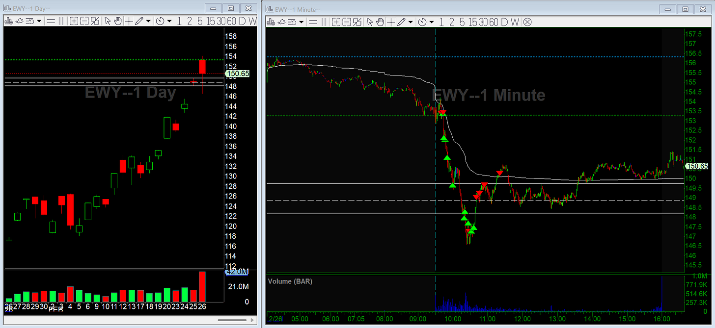 EWY is the ETF for South Korea’s large and mid-cap index. Not in my normal universe, but it was more than 10 ATRs extended from its 50-day on the daily. Overnight futures were strong and it gapped up big, but premarket started showing weakness. Based on some metrics I track, I thought this might be the pullback day so I came in short biased.