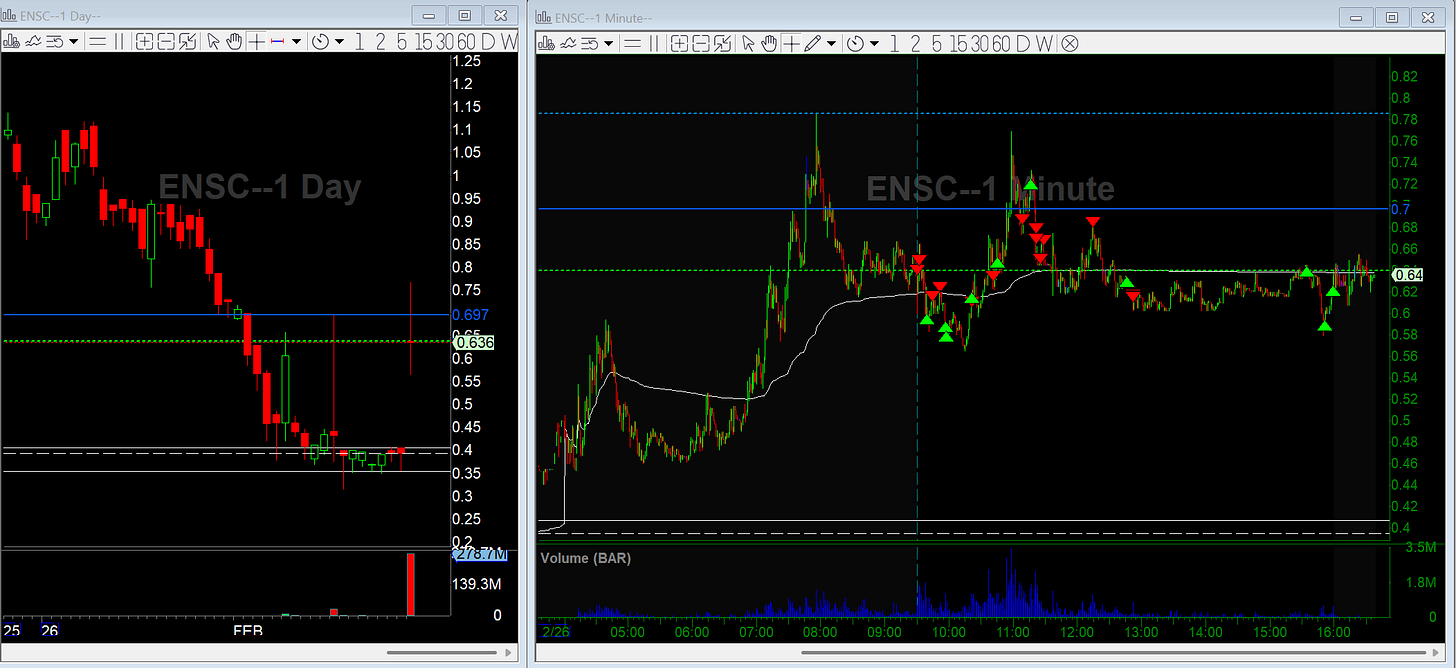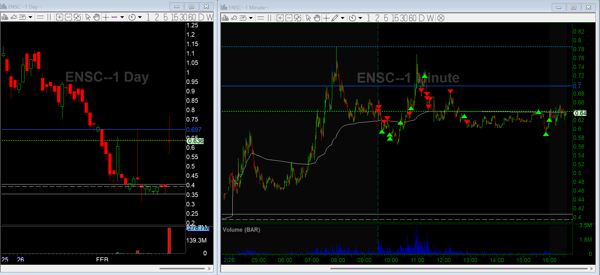 ENSC was the main gapper and trading huge volume. It had all the ingredients to be a problem ticker, so I stayed cautious. I caught a clean short at the open, but when it bounced and reclaimed VWAP, I flattened. Volume started pouring in so there was no reason to be aggressive.
