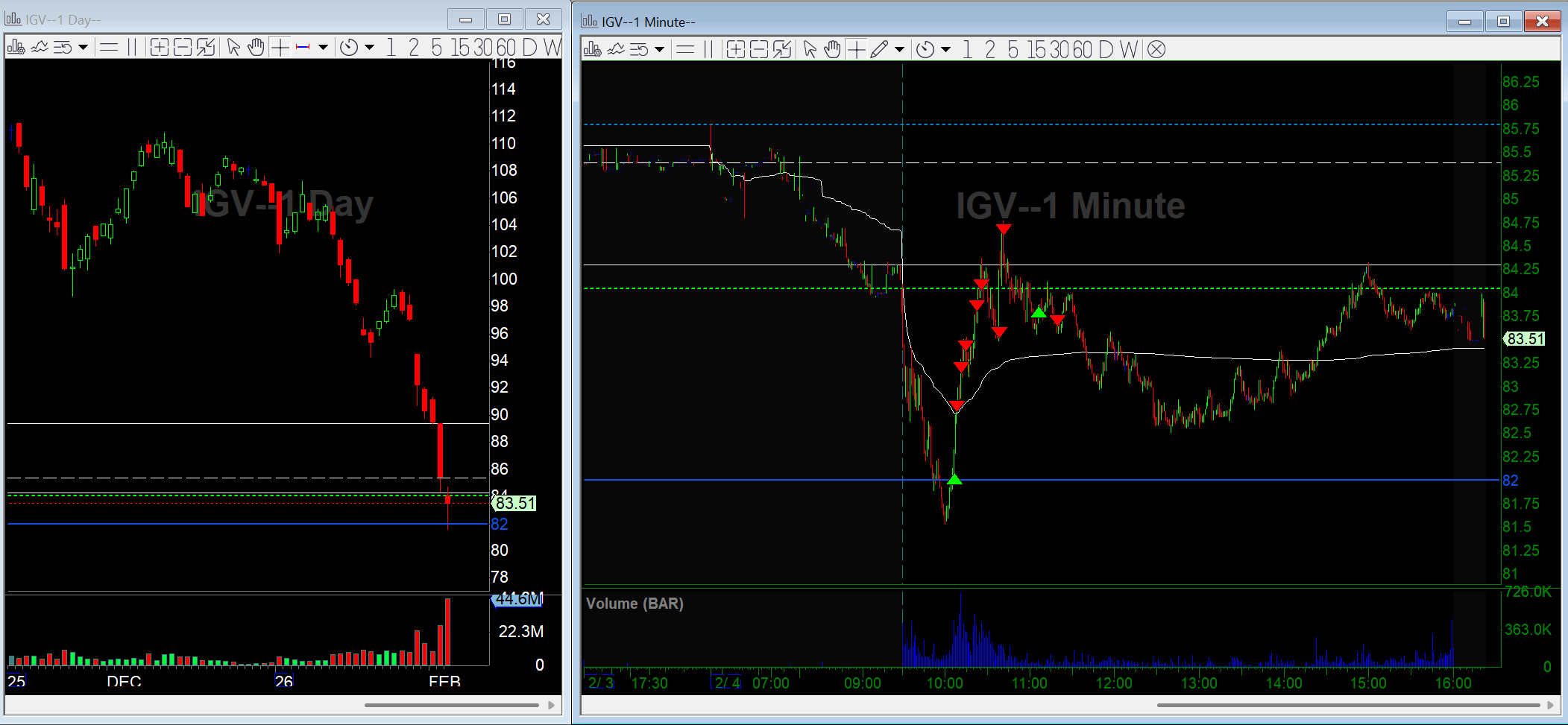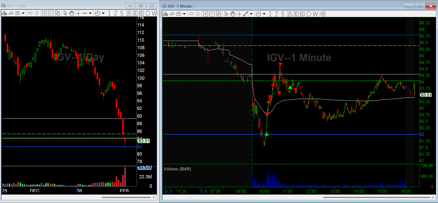 Software has been getting hit hard. IGV was gapping down on the day and sold off hard for the first 30 minutes of the open, extending an already stretched move on the daily chart. I had a key daily pivot marked at 82 and waited to see how price would react in that range.