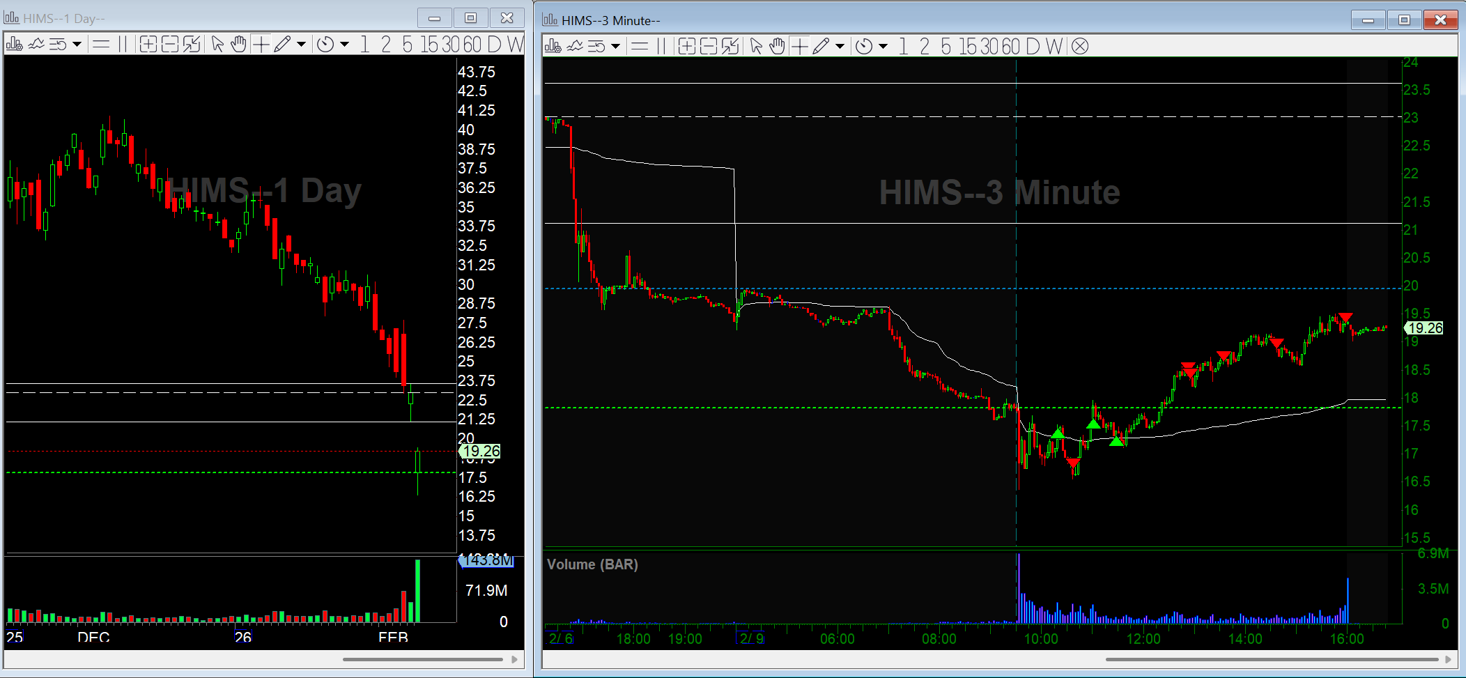 HIMS was the main focus after a big gap down; first attempt failed, second worked.
