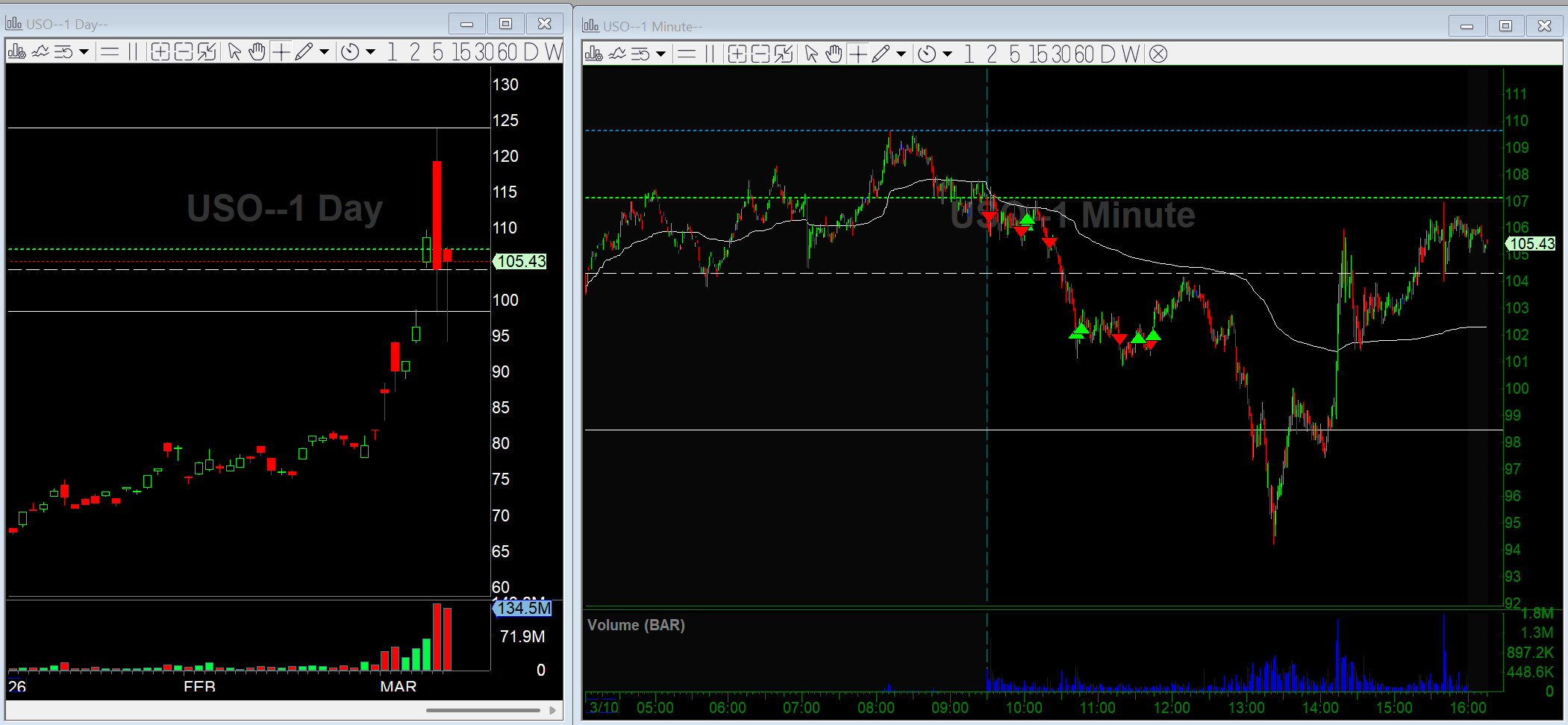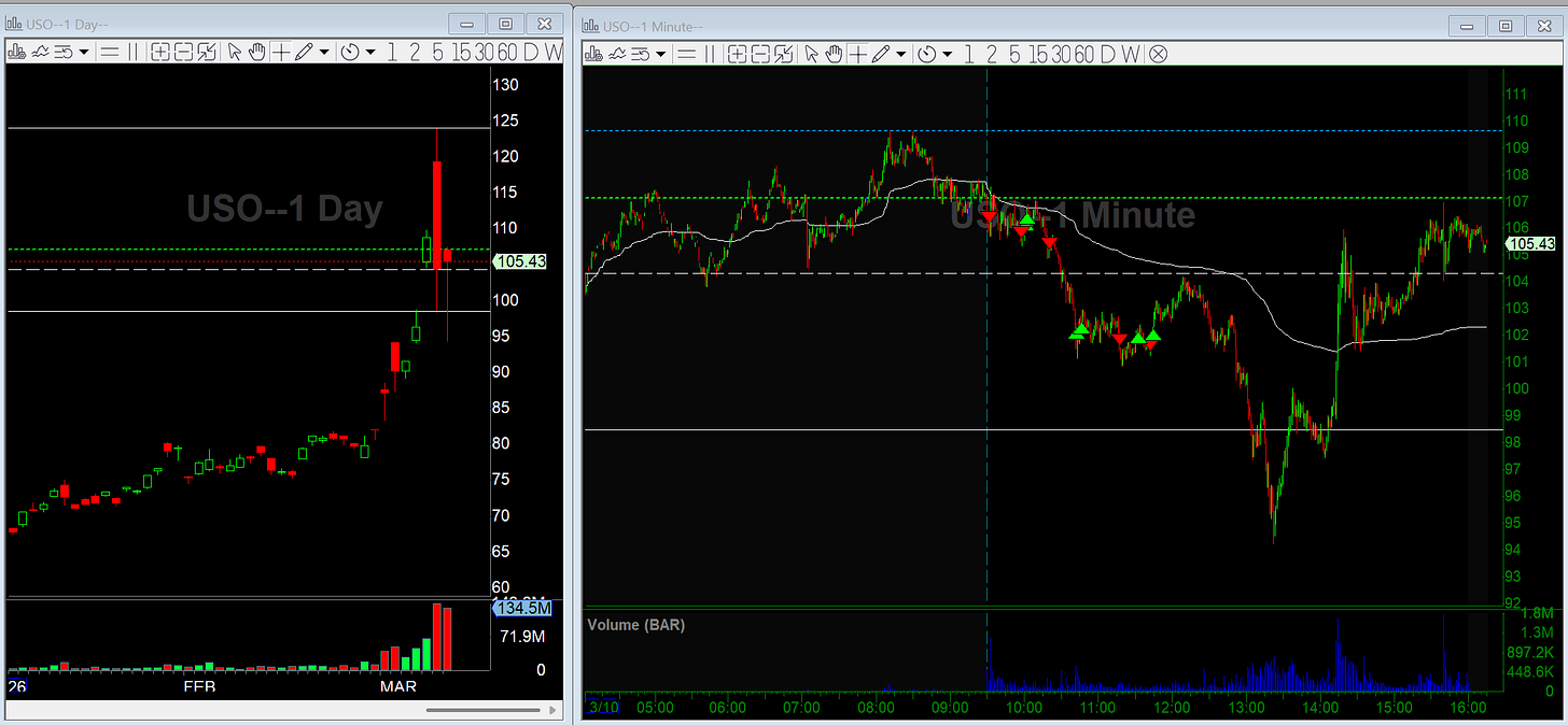 Oil eventually collapsed later in the day and I missed the bigger second leg down toward 95 on USO. It gave a great long opp as the move down was sharp, and if you held you got a headline boost at 2:15pm.
