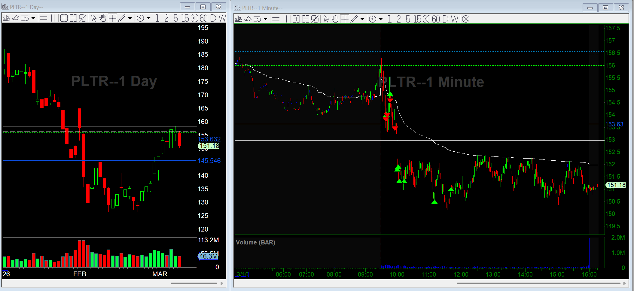 PLTR was pushing into the daily 50-day moving average and started looking heavy intraday. The main trigger was the break of the previous day’s low.