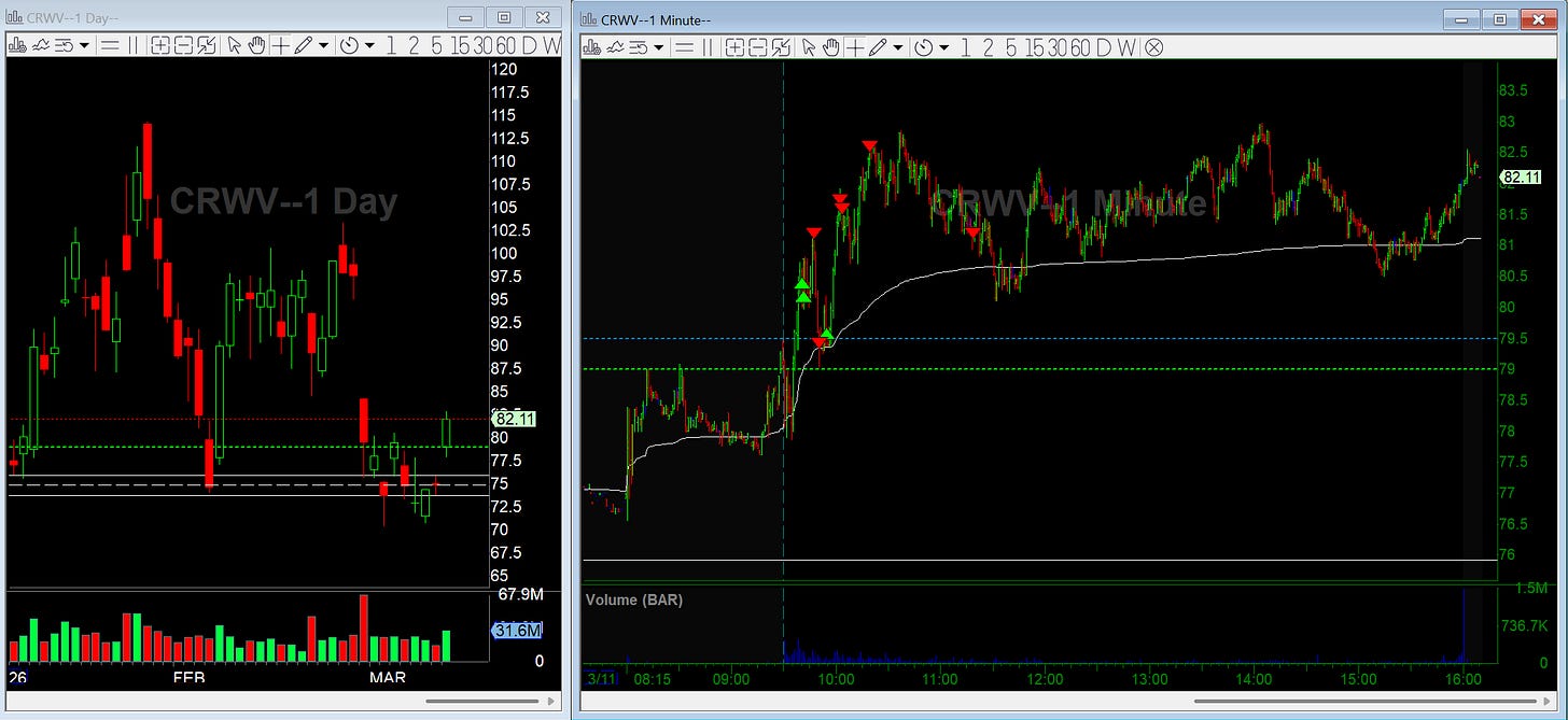 NBIS ripped off the open and broke over premarket highs, but I didn’t want to chase. Instead I looked for a sympathy name and went long CRWV. The entry was a bit late, so I trimmed quickly and then had to stop out the rest when it first pulled back.