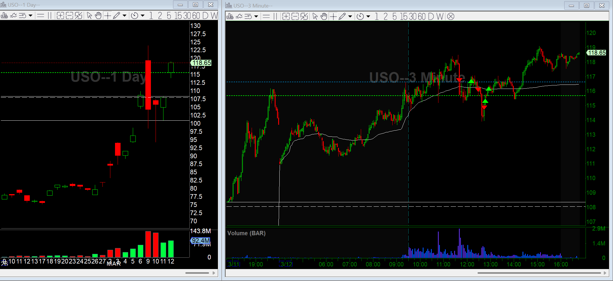 USO / Oil: Two short attempts on a news-driven drop, but oil stayed strong and reclaimed VWAP.