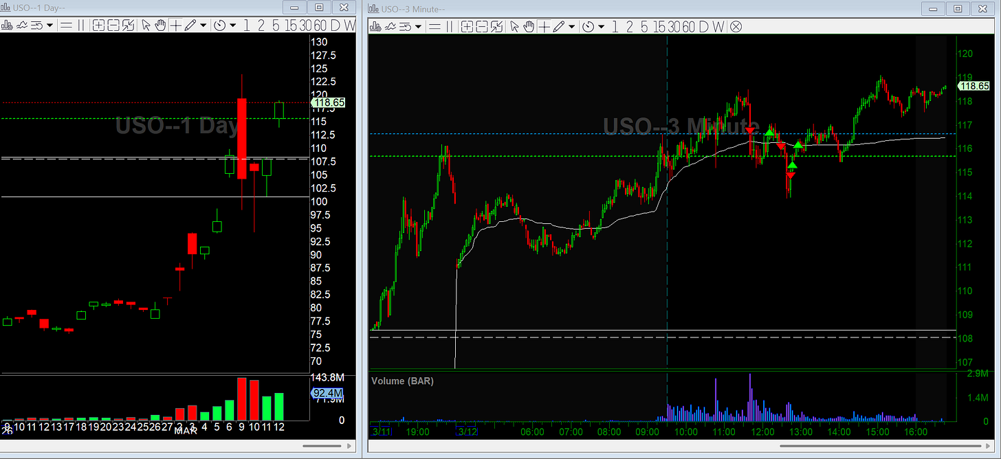 The first trade stopped out as USO reclaimed VWAP. I tried again on the next breakdown and caught a quick flush to around 114, but I held looking for a bigger move and even added a little. It V-shaped hard and forced me out again. By the end of the day oil was making new highs and still trending strong.