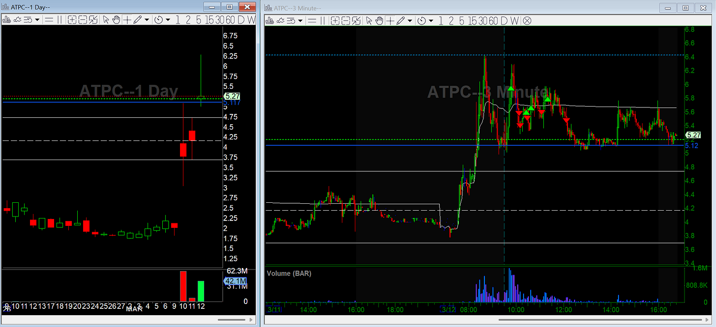 ATPC was gapping up over the prev red day highs which can lead to mega squeezes due to T+1 dynamics. I tried going long early looking for that move. The first attempt failed quickly. I tried again but the stock stayed under VWAP and every push higher got sold. After a couple attempts it was clear the move was not there and I left it alone.