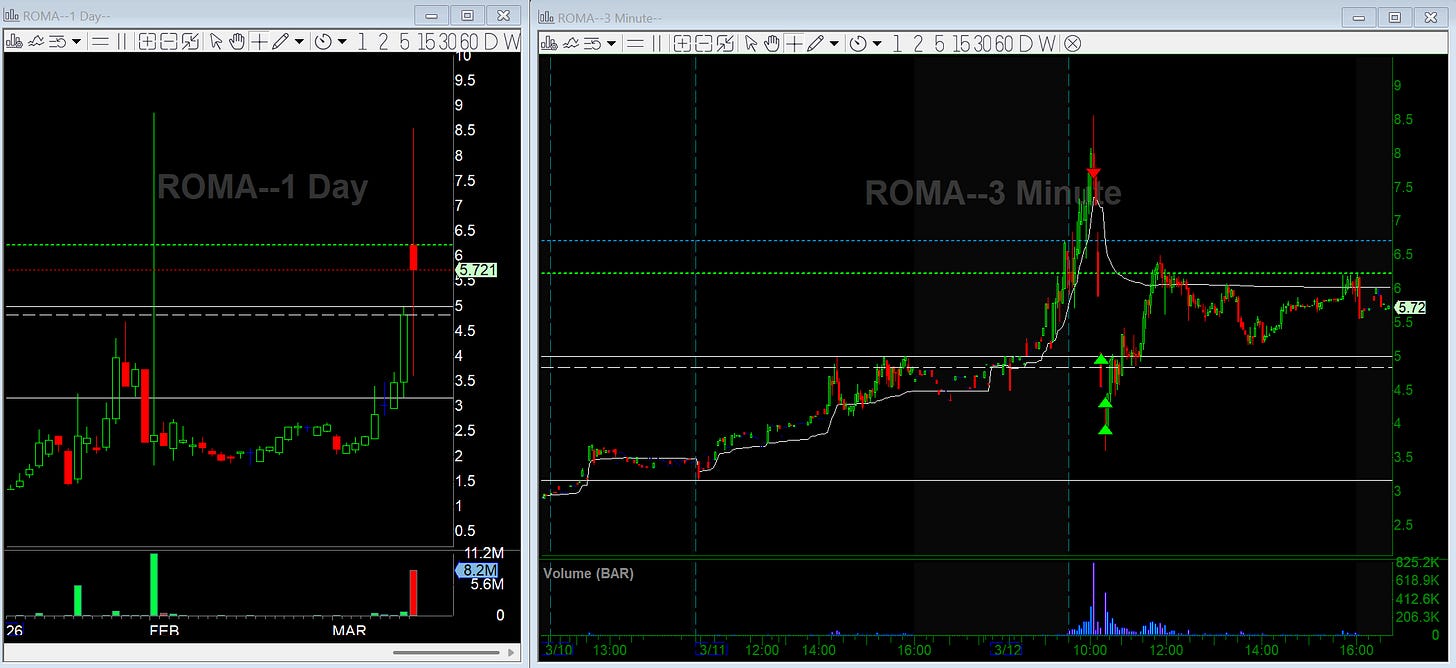 ROMA: Short near $8 on an extended move from $2. Caught multiple halt downs and scaled out from $5 to sub $4.