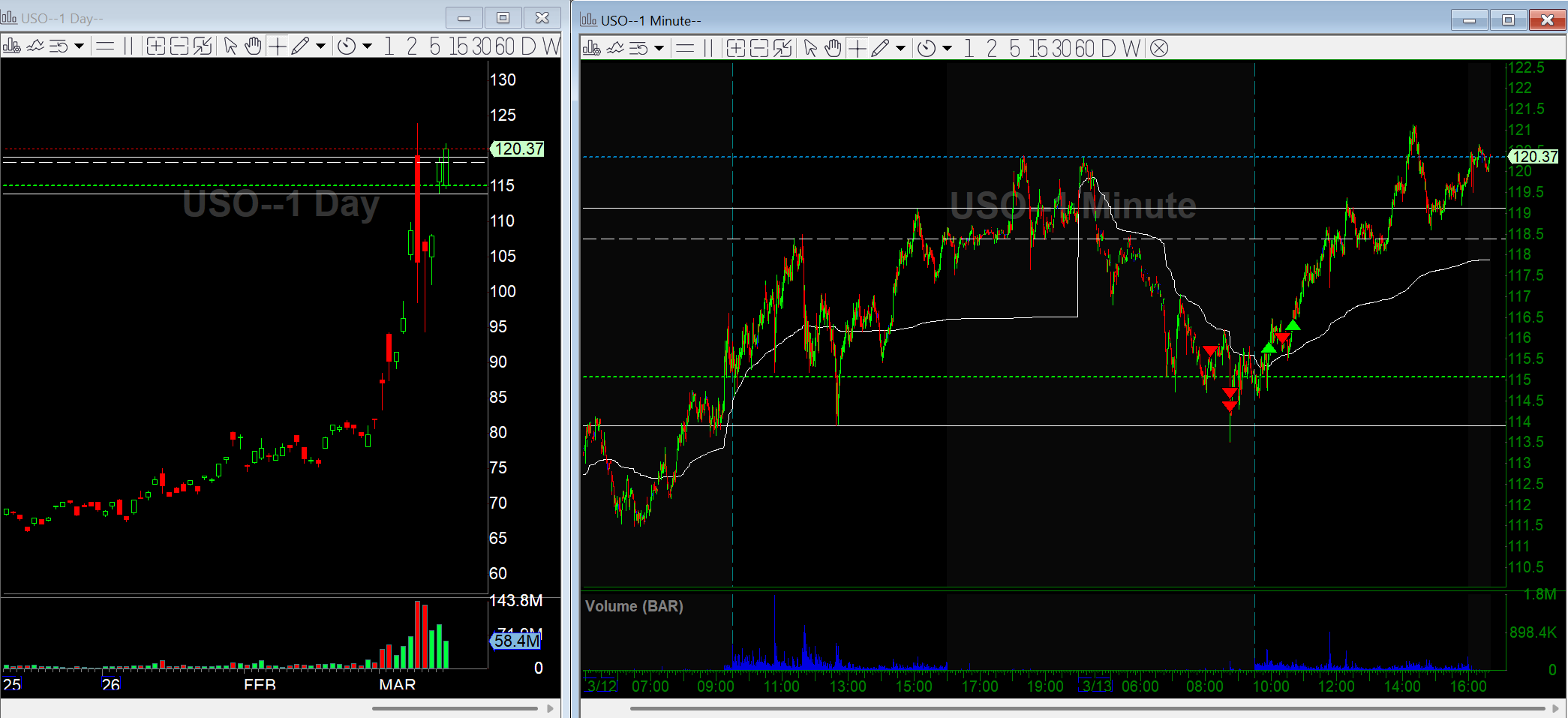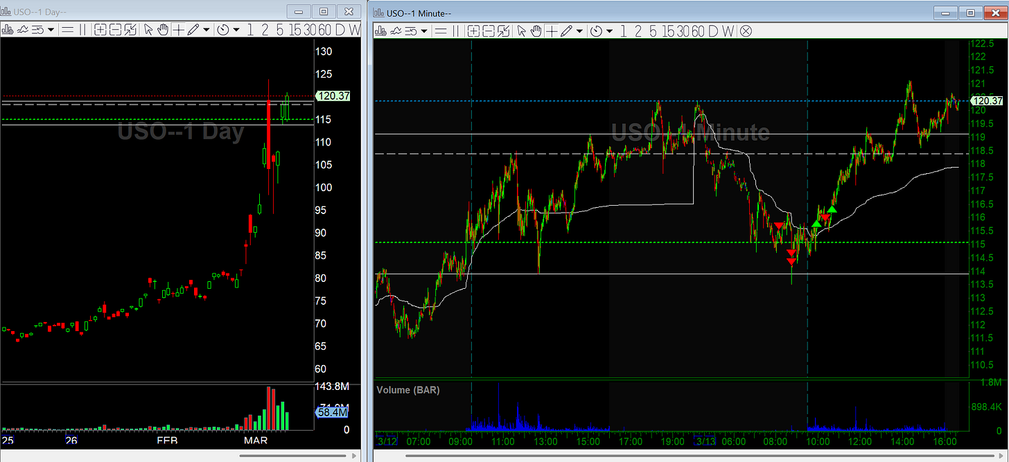Crude triggered a higher timeframe trend break in pre-market and also gapping down, so I started in short through USO. When a headline hit around 8:45am, I added to the position expecting the weakness to accelerate.