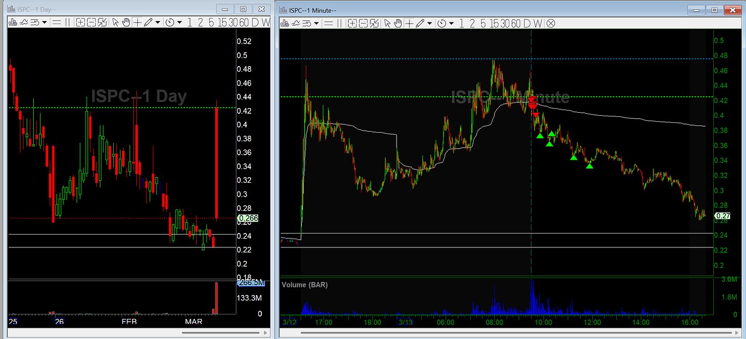 I also shorted ISPC in the morning. It’s a $0.50 stock, which isn’t ideal, but most top gappers have been subbies lately. The main reason for the trade was its history as a gap-and-fade name. Statistically these gaps tend to give back a lot of the move.