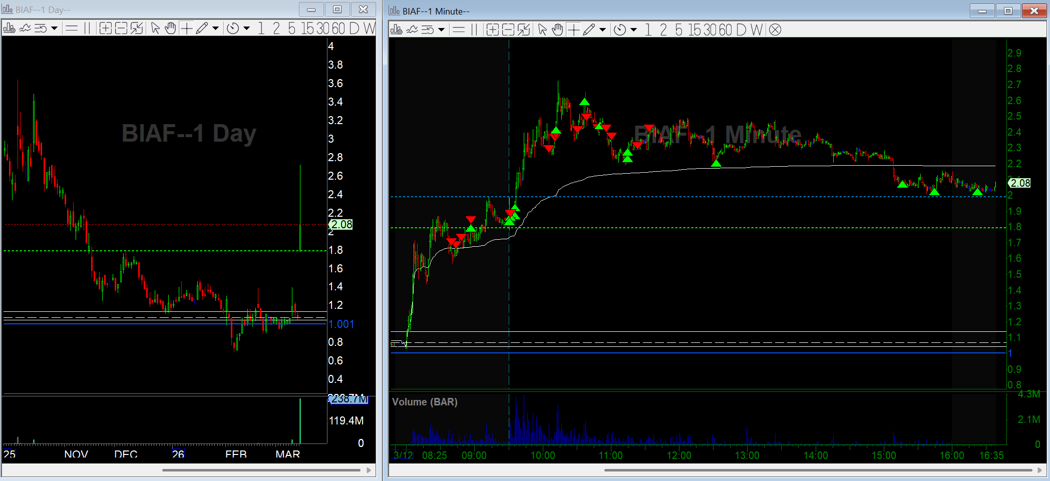 BIAF turned into a problem ticker. I kept hitting 1-minute short signals and got chopped up before finally catching the afternoon crack.