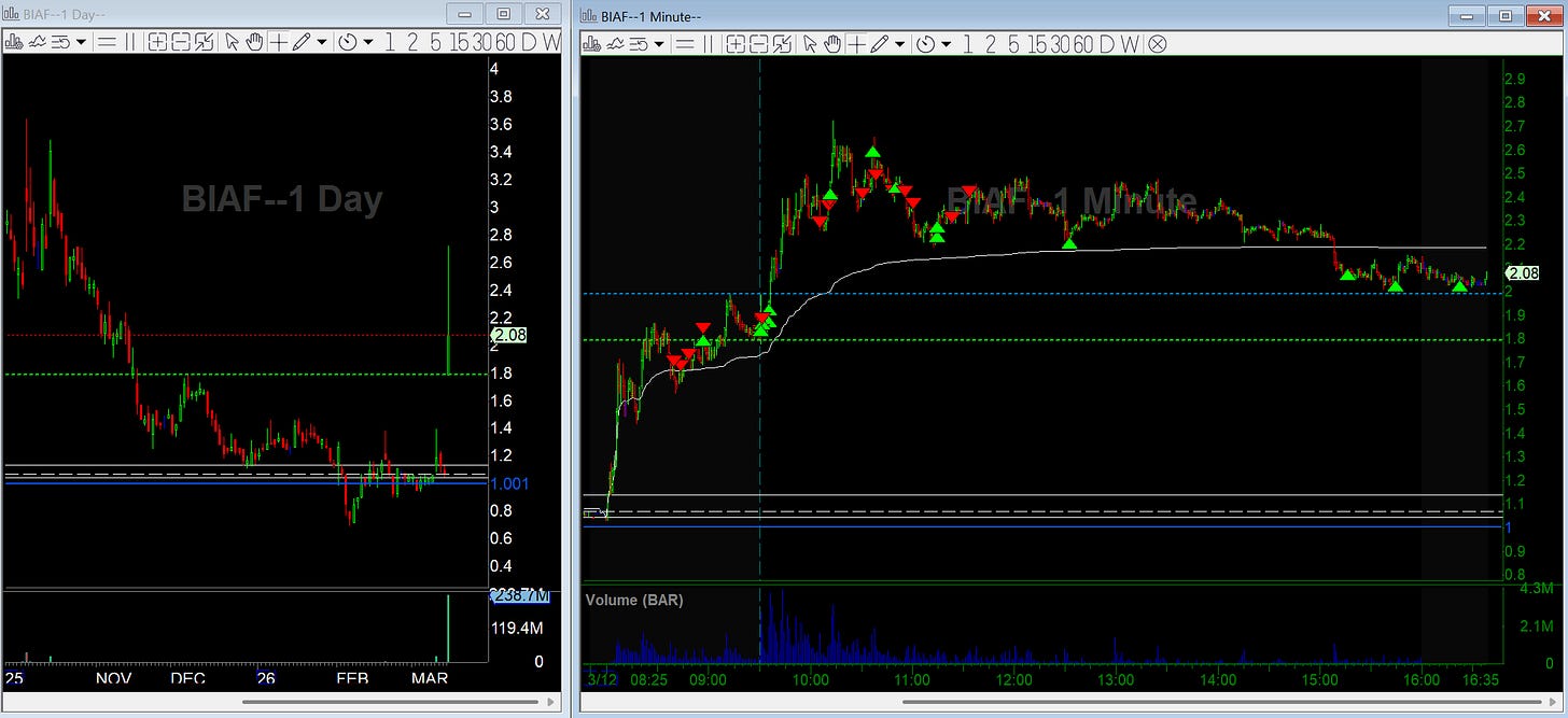 BIAF was a biotech small cap gapping up on a revenue catalyst but I didn’t think it mattered. I first tried a short in pre-market but had to stop out when it held up.
