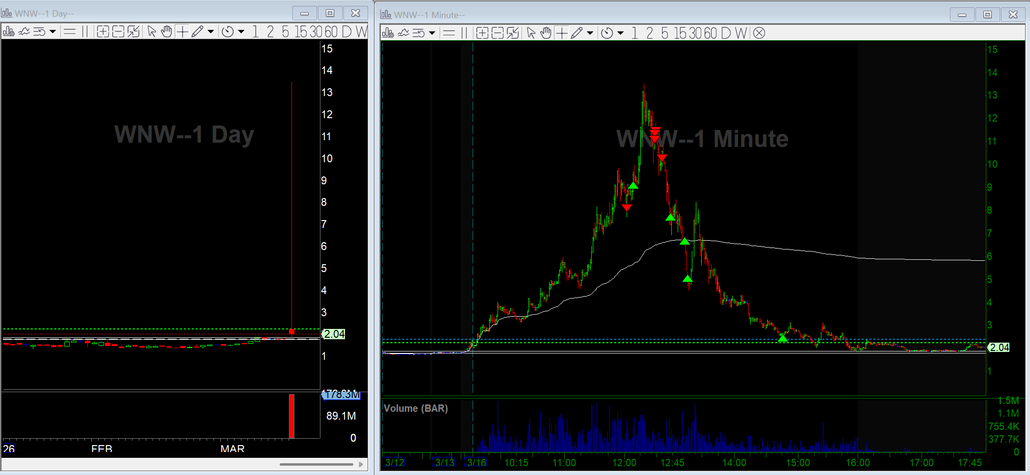 Insane liquidation move. WNW had been grinding higher all morning, running from around $2 to nearly $10 and eventually speeding up and squeezing over $13.