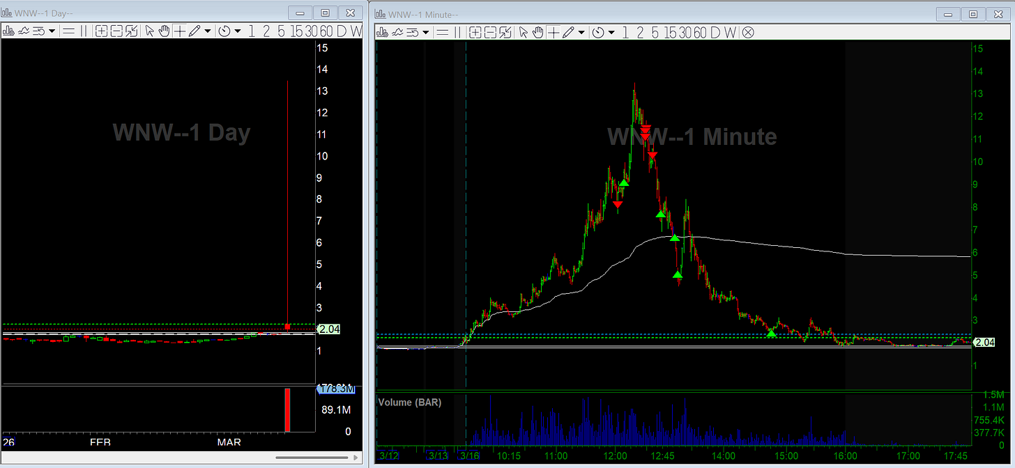 First attempt shorting WNW failed, but the second entry caught a huge fade from ~$13 to ~$2.50.