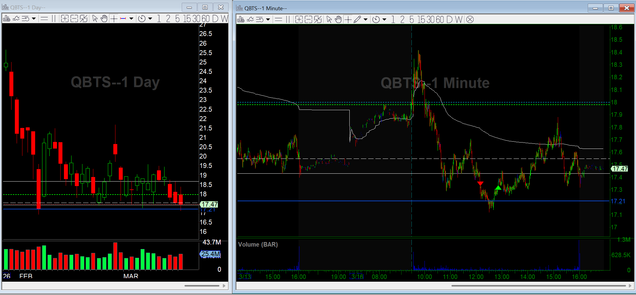 I also tried a short in QBTS looking for a daily breakdown, risking $17.70. The level held and it started bouncing, so I took the trade off at breakeven.