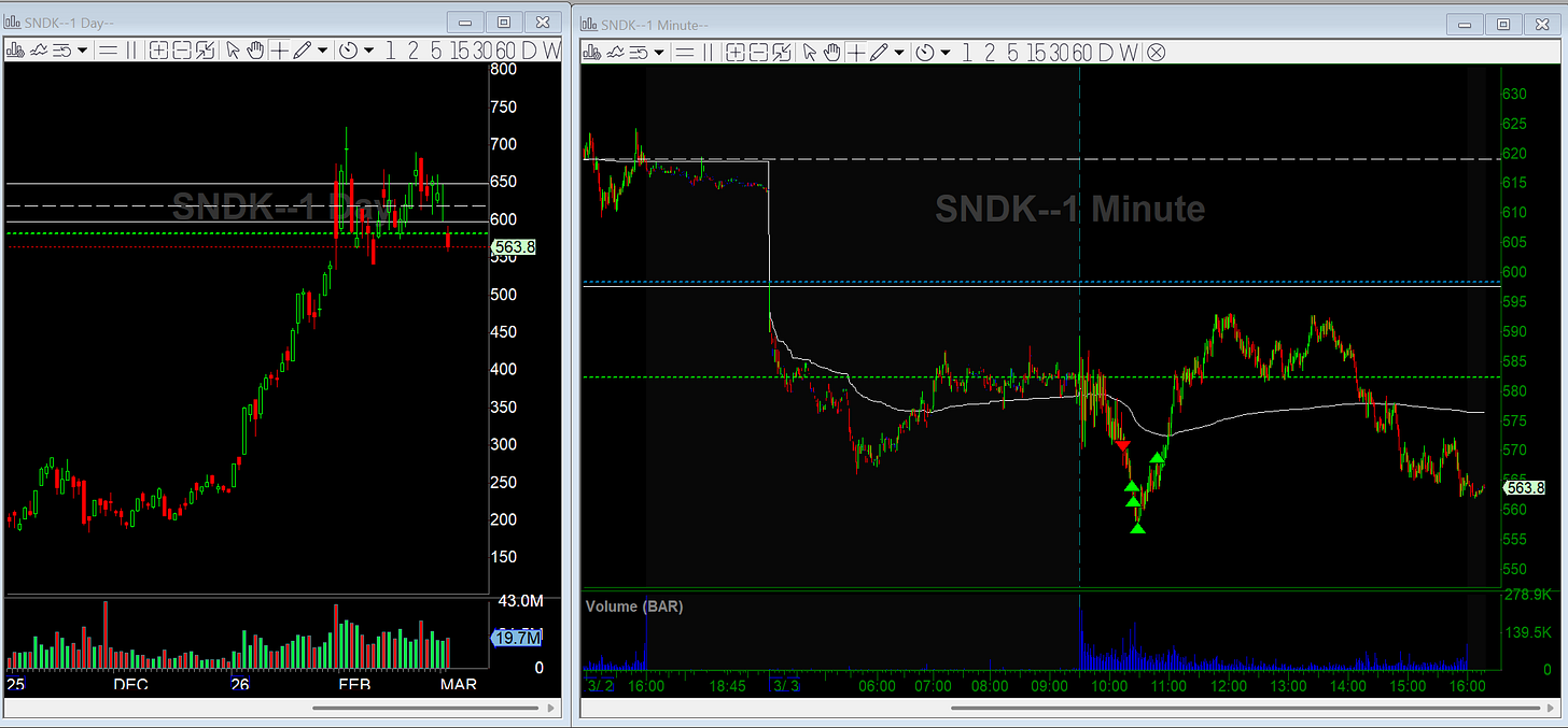 Memory stocks were weak this morning and breaking trend. I shorted SNDK on the low of day break while the market was rolling over. It flushed fast and I covered into 560. Set the rest to breakeven and got stopped on the bounce for a quick and easy trade.