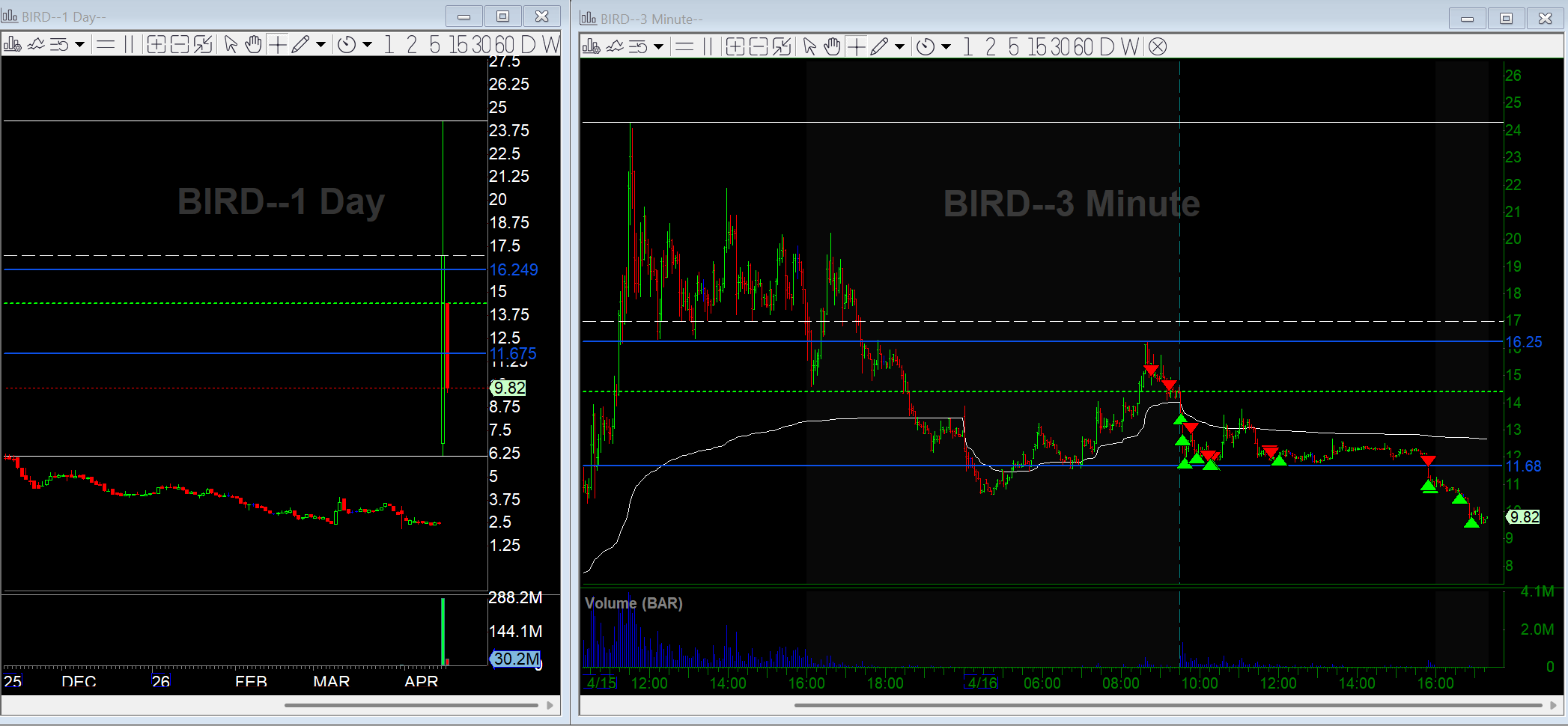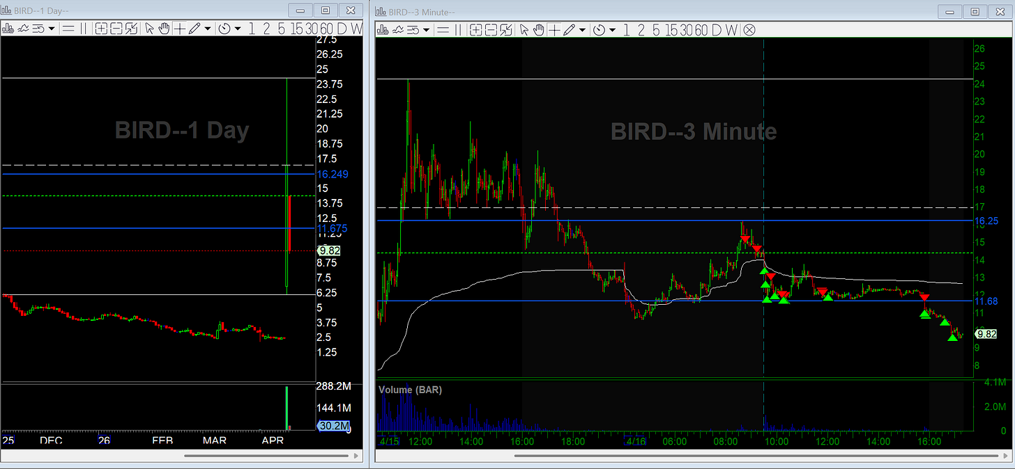 BIRD was on absolutely everyone’s radar yesterday, non-traders included, and that kind of mainstream attention usually signals the move is close to running out. Do you find that extreme public attention on a name makes you more or less aggressive fading it?