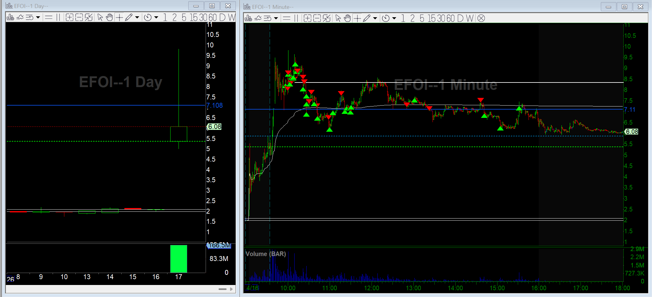 EFOI was the top gapper where I tried the long side first off the $7 level, then flipped short when it made a lower high.