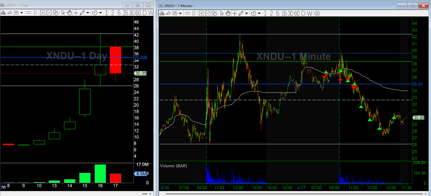 I carried a short on XNDU from yesterday and held a small overnight piece, cutting it pre-market when the stock bounced and retested $40. The thesis was still intact, so I waited for it to get tight and resolve, sized in under $35, and got a great move all the way down to $28.